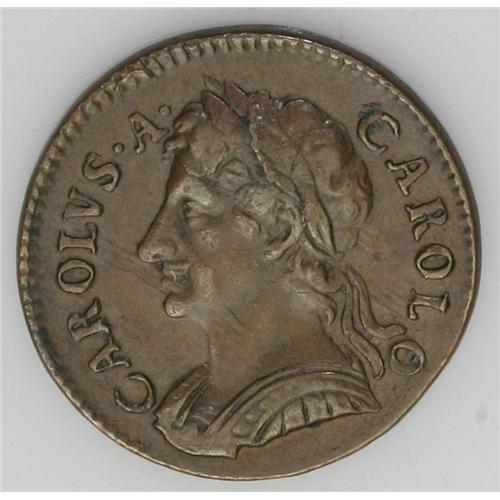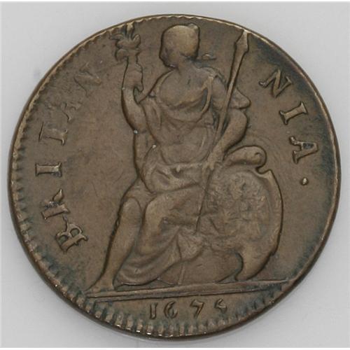 <B>Charles II farthing, 1675. </B></I>S-3394. These are all quite scarce when the surfaces are pleasing. Choice VF, light brown.