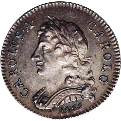<B>Charles II pattern farthing in silver, 1665. </B></I>P-433 (rare), plain edge. Long Hair (the king's long locks flow over his armored shoulder). These mementoes of the Restoration for many years were thought to be medallions but Peck took them seriously as pattern farthings, which as a denomination began during this reign. These are commonly seen in the UK in low grade. This specimen is finer than almost all others you will ever encounter. Choice AU, handsome bright gray toning. A charming piece. Ex Reiver collection.