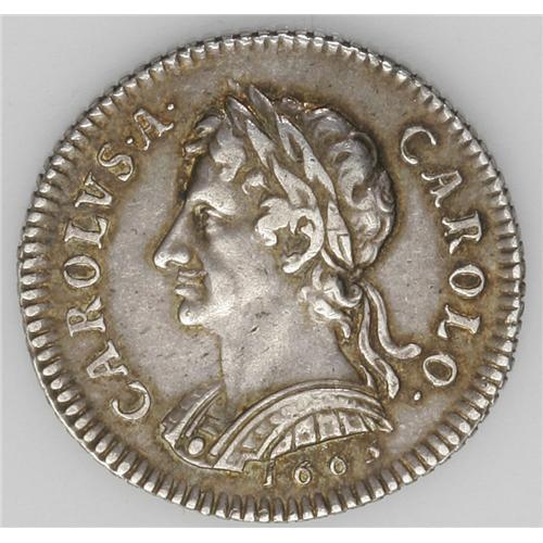 <B>Charles II pattern farthing in silver, 1665. </B></I> Peck-407 (very scarce). Short Hair type (hair stops at base of king's neck). VF, light gray, quite pleasant.