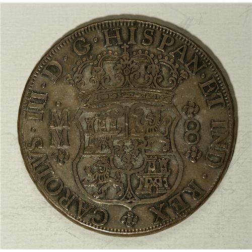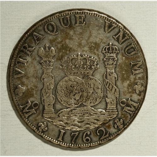 <B>Charles III 8 Reales 1762-Mo MM,</B></I> KM-105, cross-tip splits HI, Choice VF, old-time somewhat mottled, light golden gray toning, nicely centered. From a famous old collection.<BR><I>From the Louis E. Eliasberg, Sr. Collection</B></I><BR><BR><b>Shipping:</b> Coin/Currency (<a target="_blank" href="http://www.heritageauctions.com/common/shipping.php">view shipping information</a>)