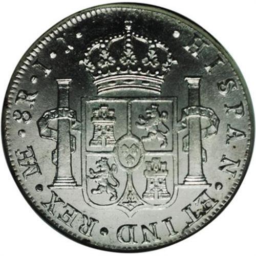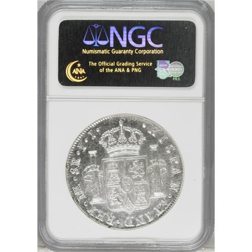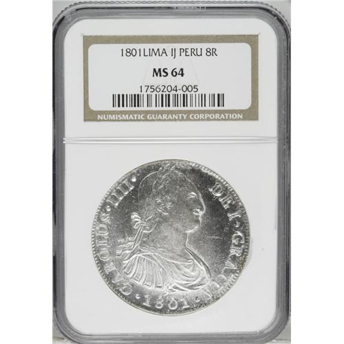 <B>Charles IIII 8 Reales 1801-IJ, </B></I>KM97, MS64 NGC, choice frosty white luster with one small spot by the D of DEI, very scarce grade.<BR><BR><b>Shipping:</b> Coin/Currency (<a target="_blank" href="http://www.heritageauctions.com/common/shipping.php">view shipping information</a>)