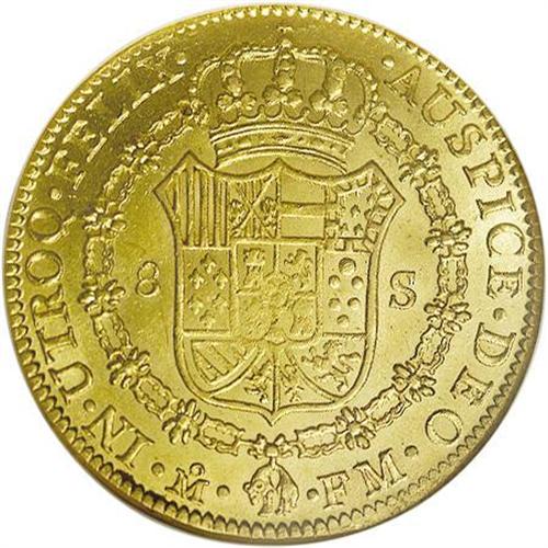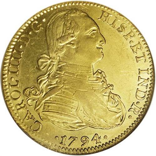 <B> Charles IIII gold 8 Escudos 1794-FM,</B></I> KM159, MS62 NGC. Full, brilliant mint luster with nice golden color. A premium example of this type.
