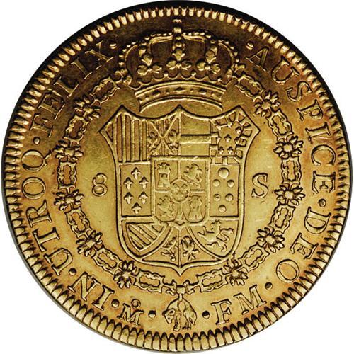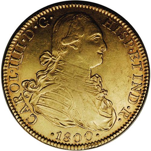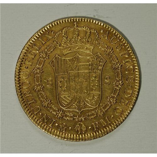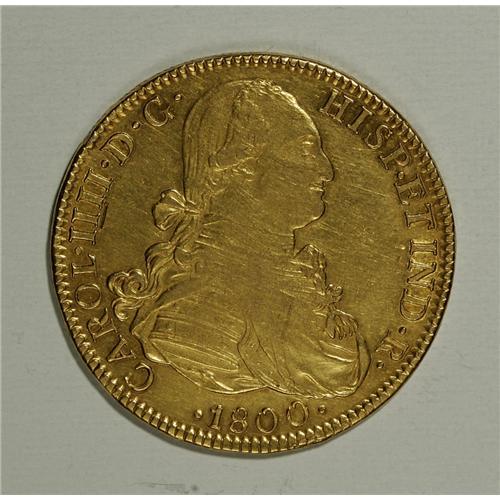 <B>Charles IIII portrait gold 8 Escudos 1800-Mo FM,</B></I> KM-159, About XF with a pleasing appearance because of its soft remnant luster and gold toning. On close inspection there are some little hairline scratches, and a long mark under the king's digits "IIII". Neat date.<BR><BR><b>Shipping:</b> Coin/Currency (<a target="_blank" href="http://www.heritageauctions.com/common/shipping.php">view shipping information</a>)