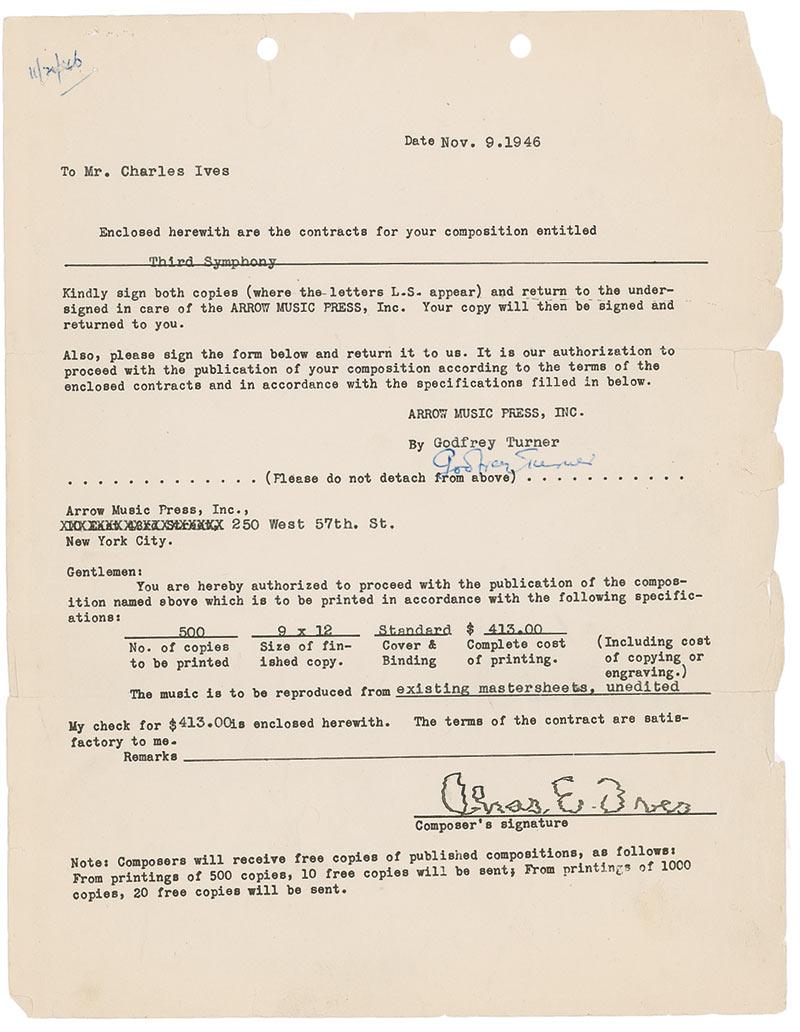 Composer (1874–1954) regarded as one of the first American composers to garner international acclaim. DS, signed rather shakily, as was his typical style, “Chas. E. Ives,” one page, 8.5 x 11, November 9, 1946. Ives agrees to terms for the publication of his work, ‘Third Symphony.’ In part: “You are hereby authorized to proceed with the publication of the composition named above which is to be printed in accordance with the following specifications.” Those details included the printing of 500 copies at a cost of $413.07. In very good condition, with a diagonal crease, two filing punch holes at the top, staple holes, wrinkling, and several tiny tears along the right edge.