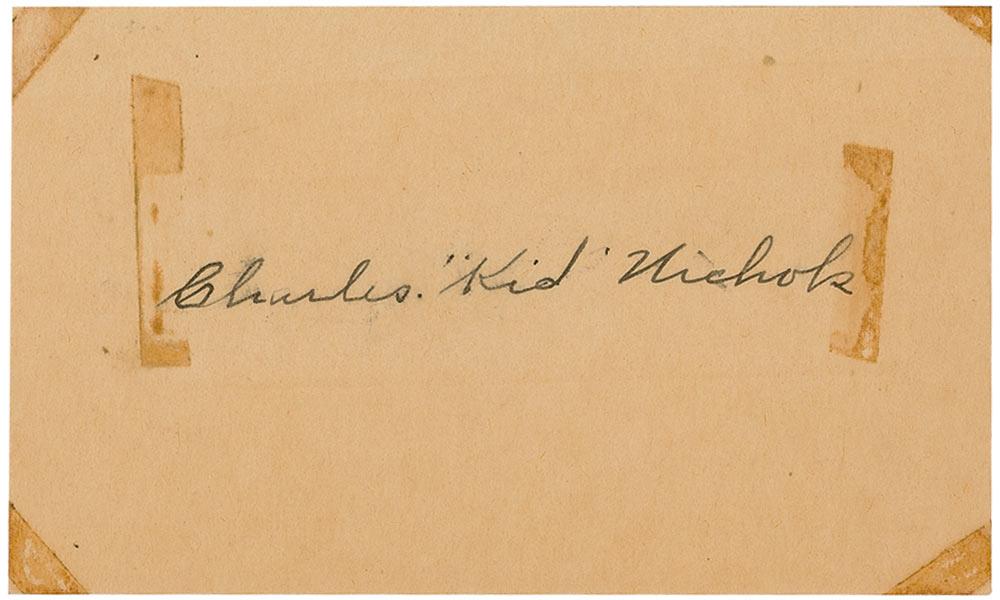 Vintage fountain pen signature, “Charles ‘Kid’ Nichols,” on an off-white 5 x 3 card. In very good condition, with mild uniform toning, areas of old adhesive tape residue at the corners and to the left and right of his name touching portions of his name, and a few brushes.