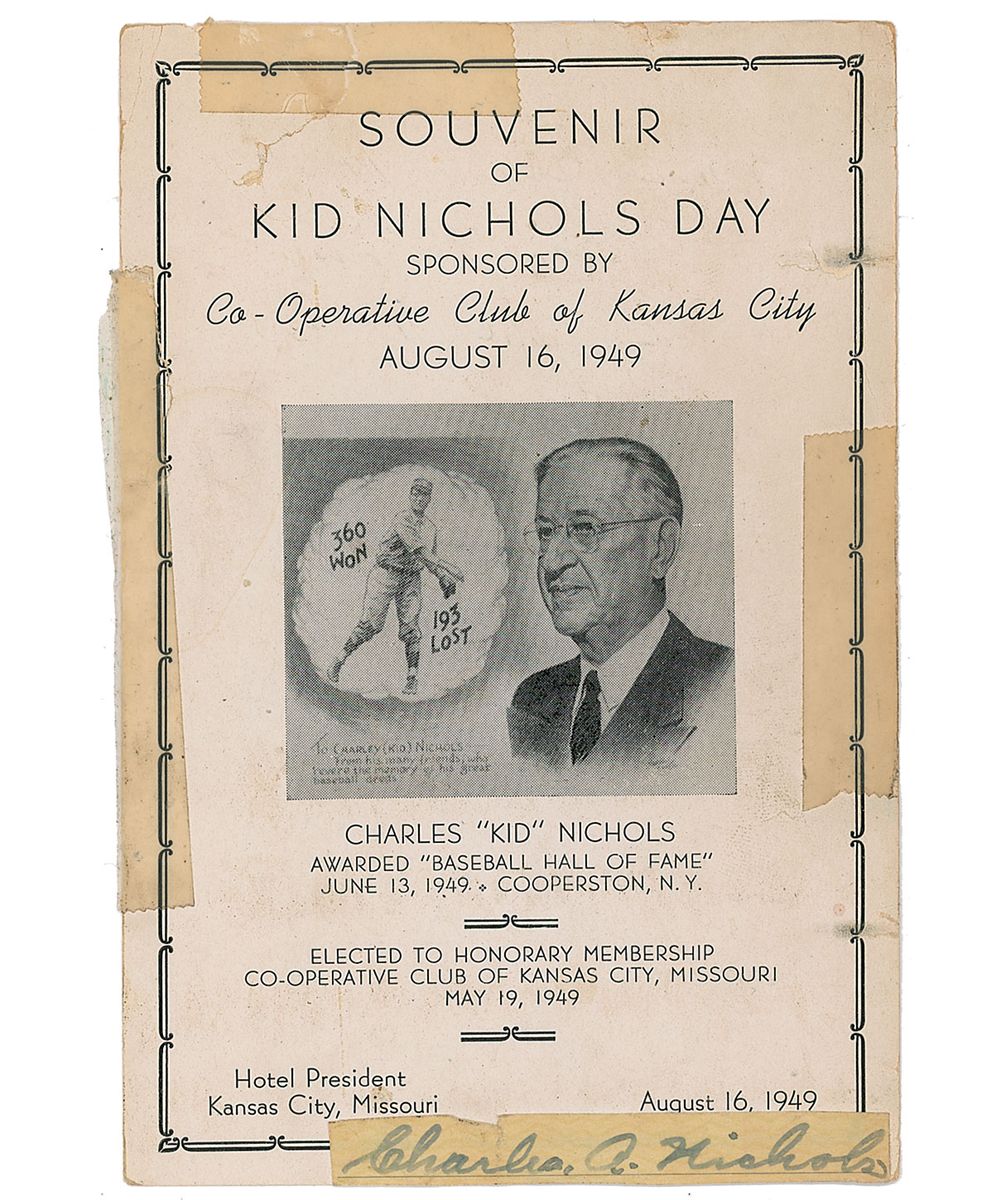 Hall of Fame pitcher (1869–1953) who, at the age of 32, became the youngest hurler to win 300 games. Vintage ink signature, “Charles A. Nichols,” on an off-white 3 x .25 clipped slip affixed to the bottom of a 4 x 6 Kid Nichols Day souvenir card. A repaired vertical separation through a single letter of first name and some light toning, otherwise fine condition.