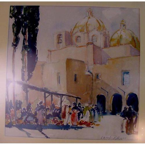 Charles Killgore was from Chicago, where he worked as an artist. He also exhibited at the Penn. Academy of Fine Arts in the late 1920s and early 30s as well as the Art Institute of Chicago. Signed lower right, this scene shows a group of vendors under an open air covered area with a large domed church in the background, possibly from the Middle Eastern area. The condition of the watercolor is very good with no visible foxing or surface problems. Site size: 18" wide by 19" tall plus a wide matting and modern very attractive frame.