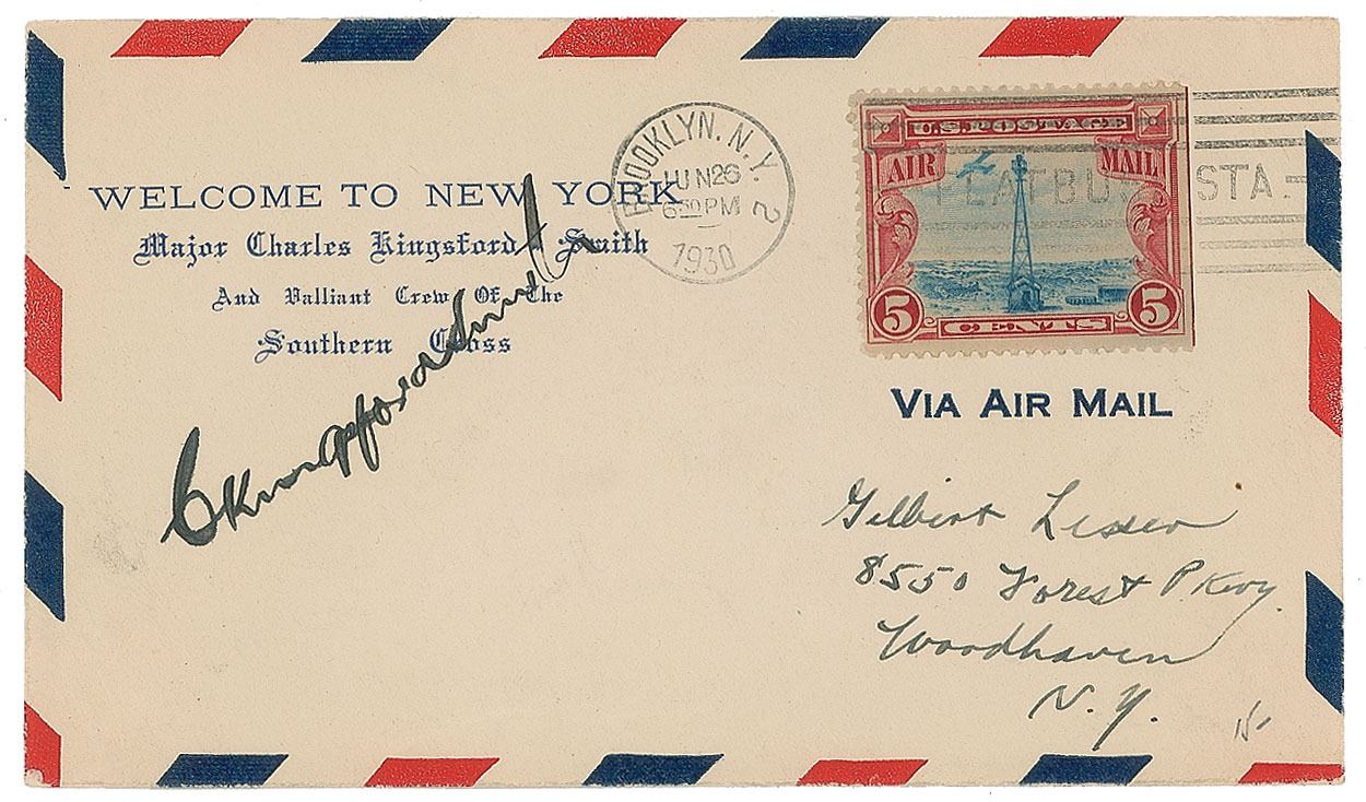 Airmail cover honoring Kingsford-Smith's arrival in New York, boldly signed in fountain pen, "C. Kingsford-Smith." In fine condition.