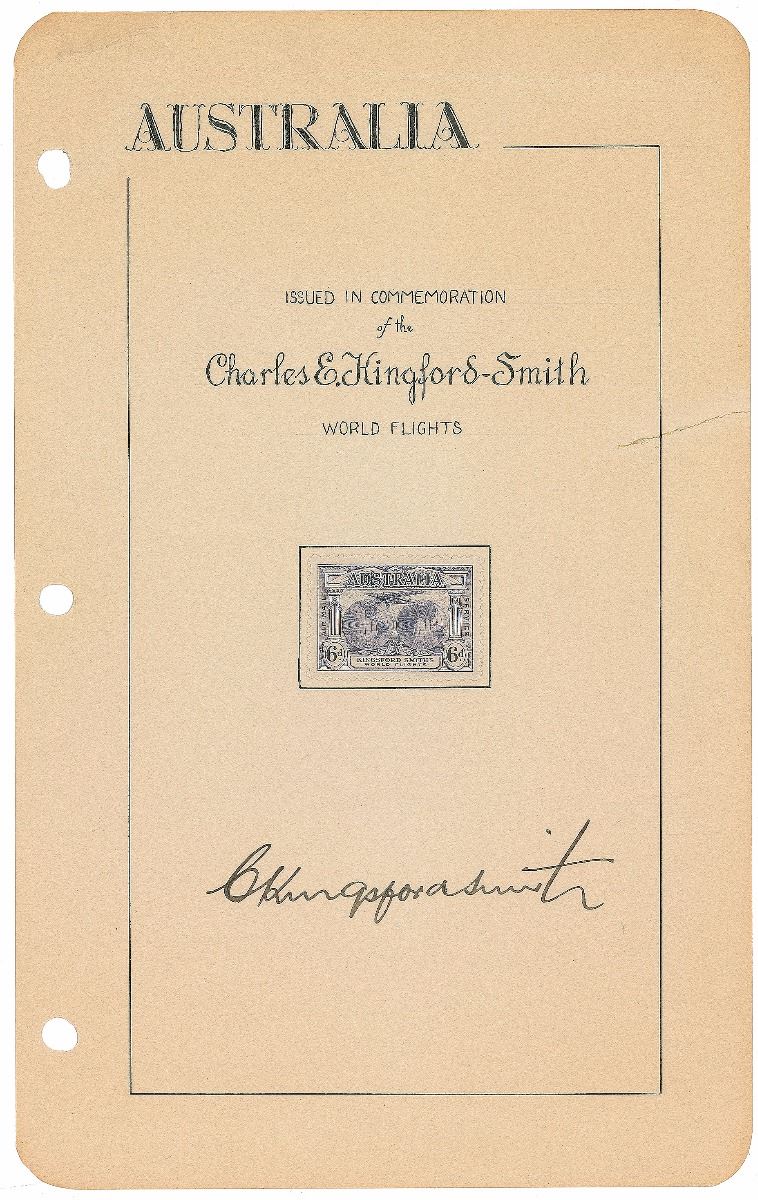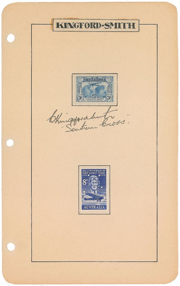 Australian aviator (1897–1935) who made the first trans-Pacific flight from the United States to Australia in 1928. He disappeared during a flight over the Andaman Sea in 1935. Two fountain pen signatures, “C. Kingsford Smith” and “C. Kingsford Smith, ‘Southern Cross,’” on individual off-white 6 x 9.5 sheets hand-embellished with calligraphic titles and Australian postage stamps. In fine condition.