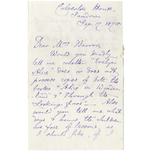 <B> Charles L. Dodgson Autograph Letter Signed </B></I> <I> "C.L. Dodgson." </B></I> Two pages, 4" x 6.2", Calverton House, Sandown, September 17th, 1875. To a Mrs. Barrow. A superlative letter mentioning Dodgson's most famous works! In part, <I> "Would you kindly tell me whether 'Evelyn Alice' does or does not posess copies of both the books 'Alice In Wonderland' and 'Through The Looking Glass' ---Also would you tell me what days & hours the children are free of lessons…</B></I>" <r The letter is in very fine condition; usual folds are present; mounting traces on the verso. Accompanied by LOA from PSA/DNA.