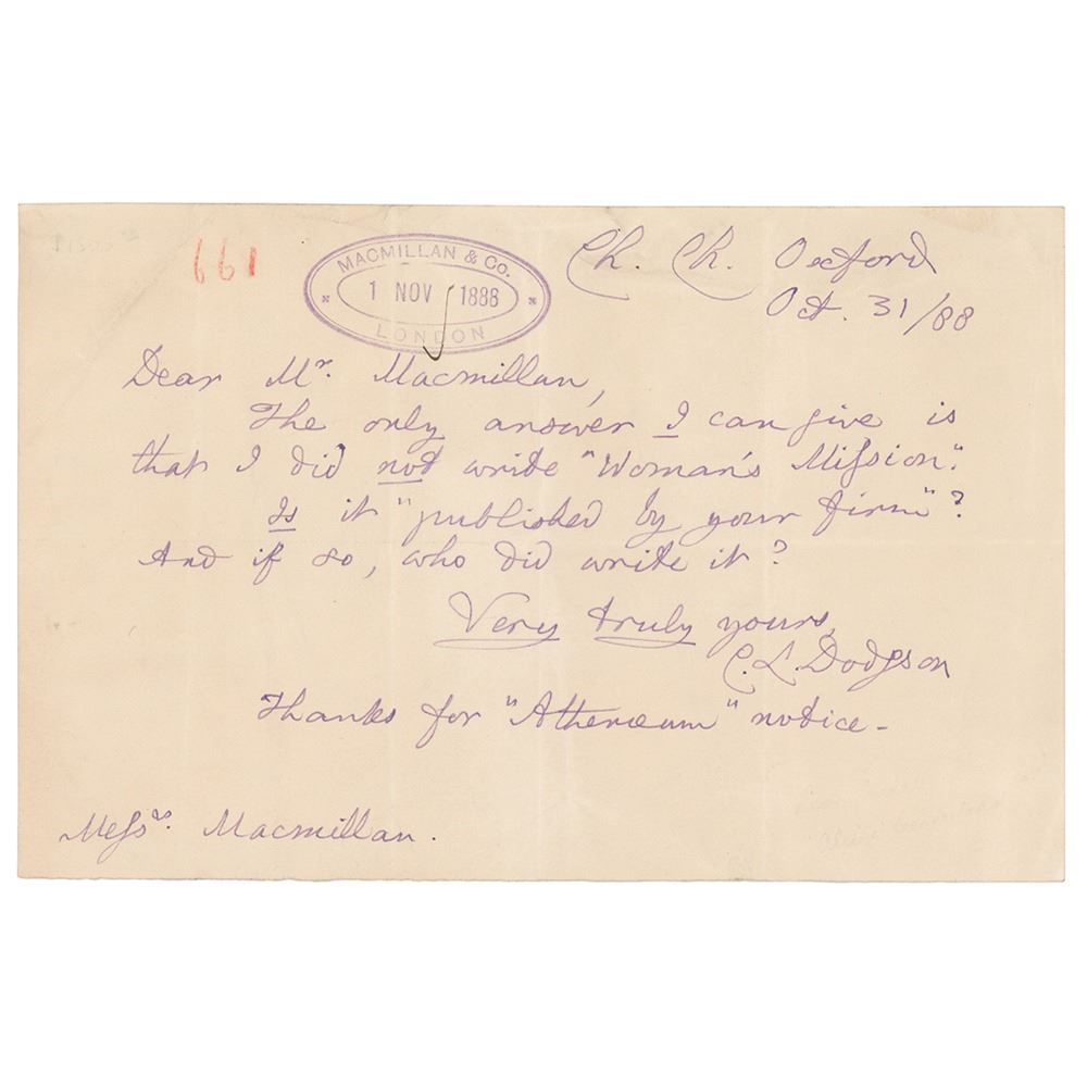 ALS signed “C. L. Dodgson,†one page, 8 x 5, October 31, 1888. Handwritten letter to Alexander MacMillan, the cofounder of Macmillan Publishers, in full: "The only answer I can give is that I did not write 'Woman's Mission.' Is it 'published by your firm'? And if so, who did write it?" Dodgson adds a brief postscript: "Thanks for 'Athaneum' notice." In fine condition, with intersecting folds and light creasing, none of which affect the handwriting and its bold ink.