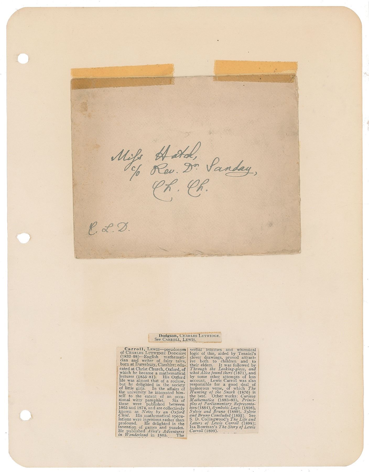 Mailing envelope, 5.5 x 4.25, no date, addressed in the hand of Charles L. Dodgson to "Miss Hatch, c/o Rev. Dr. Sanday, Ch. Ch.," and signed with his initials in the lower left, "C. L. D." The envelope is tape-affixed to an 8.5 x 11 sheet with attached obituary clipping. In very good to fine condition, with light toning and soiling.