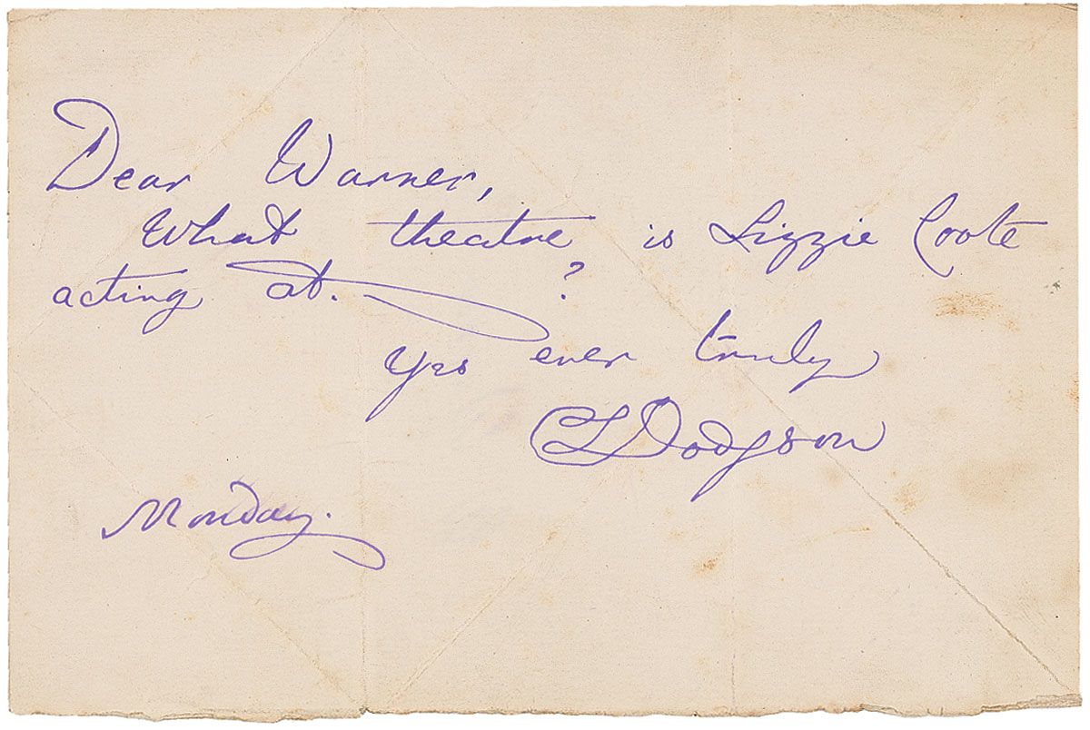 Beloved British author of Alice’s Adventures in Wonderland, better known by his pen name, Lewis Carroll (1832–1898). ANS signed “C. L. Dodgson,” one page, 6 x 4, no date, with “Monday,” written by Dodgson in the lower left corner. Brief note to W. Warner. In full: “What theatre is Lizzie Coote acting at?” On the reverse, Dodgson has addressed the note “W. Warner, Esq.” Several diagonal and vertical folds from folding for transmittal, scattered toning, and a brush to “Monday,” otherwise fine condition.
