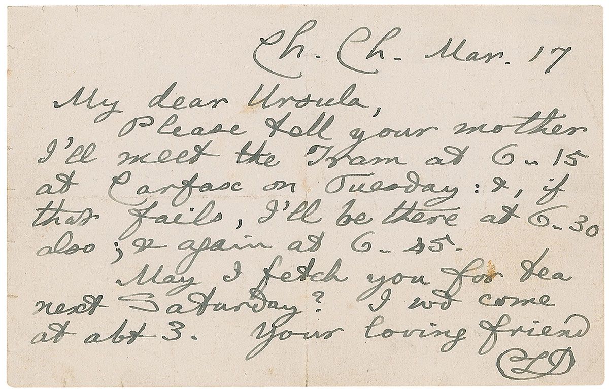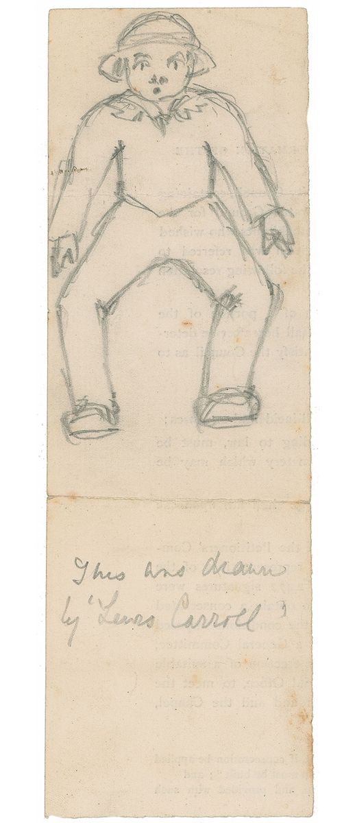 ALS signed “C. L. D.,” one page, 5.25 x 3.5, Ch[rist] Ch[urch], March 17. Letter to Ursula Mallam. In full: “Please tell your mother I’ll meet the tram at 6.15 at Carfax on Tuesday: &, if that fails, I’ll be there at 6.30 also; & again at 6.45. May I fetch you for tea next Saturday? I wd come at abt 3.” Also includes an original pencil sketch by Dodgson of a surprised young boy on an off-white 2.5 x 7.75 sheet, identified below by Mallam later in life, “This was drawn by ‘Lewis Carroll.’” In overall fine condition, with central vertical and horizontal folds to the letter, two horizontal folds to the sketch (one passing through the boy’s chest), and a couple spots of soiling to both. Accompanied by a brief statement from one of Mallam’s descendants, identifying her handwriting. Rare and desirable in any format, Dodgson’s drawings are especially scarce and highly collectible—this is just the second we have offered.