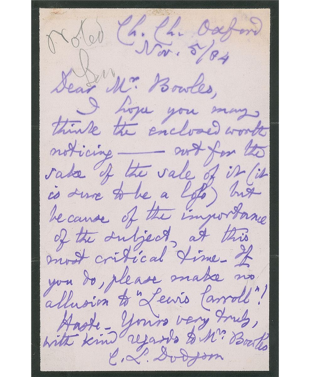 Remarkable ALS signed “C. L. Dodgson” at the conclusion and “Lewis Carroll” within the text, one page on black-bordered stationery, 4 x 6, Christ Church, Oxford, November 5, 1884. Letter to “Mr. Bowles.” In full: “I hope you may think the enclosed worth noticing—not for the sake of the sale of it (it is sure to be a loss) but because of the importance of the subject, at this most critical time. If you do, please make no allusion to ‘Lewis Carroll!’” Light soiling to the top, a slight crease to the right border, and a penciled office notation to the upper left, otherwise fine condition.