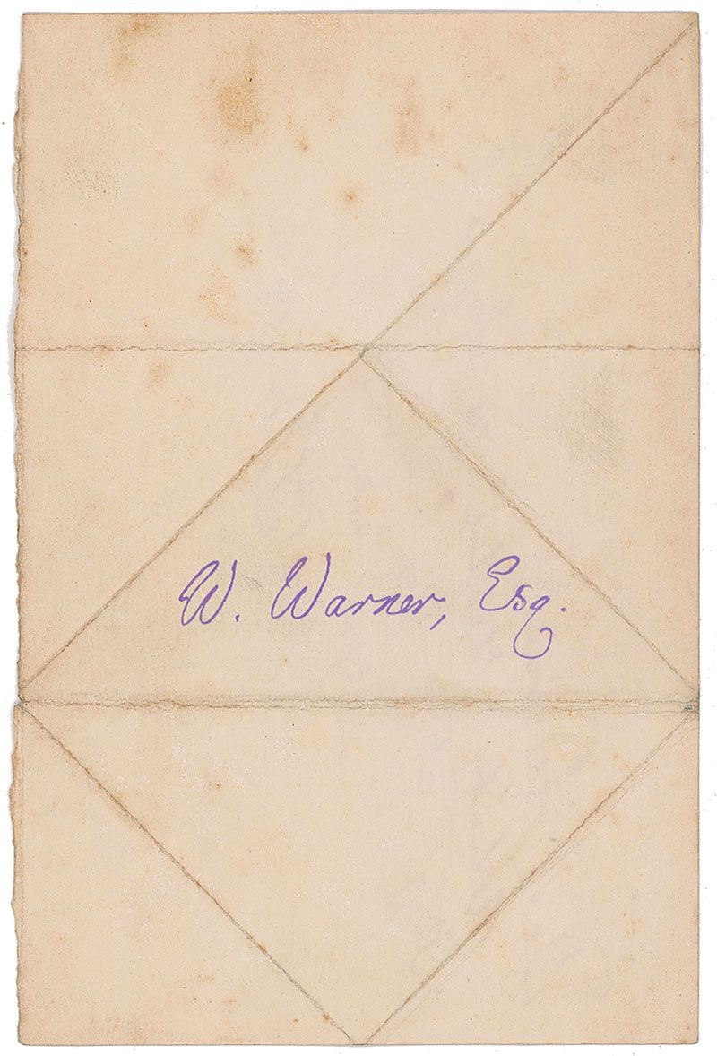 Beloved British author of Alice’s Adventures in Wonderland, better known by his pen name, Lewis Carroll (1832–1898). ANS signed “C. L. Dodgson,” one page, 6 x 4, no date, with “Monday,” written by Dodgson in the lower left corner. Brief note to W. Warner. In full: “What theatre is Lizzie Coote acting at?” On the reverse, Dodgson has addressed the note “W. Warner, Esq.” Several diagonal and vertical folds from folding for transmittal, scattered toning, and a brush to “Monday,” otherwise fine condition.