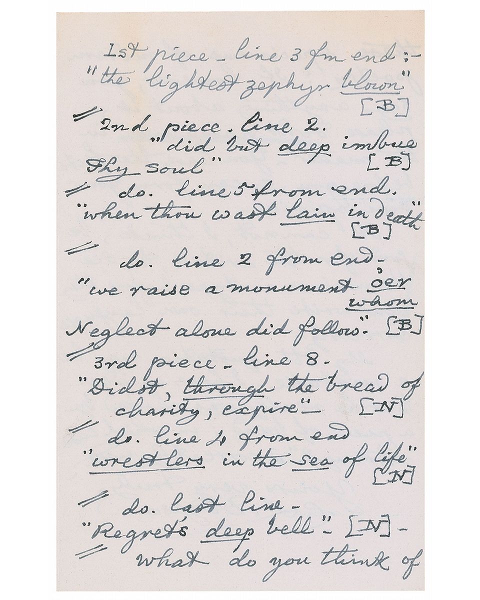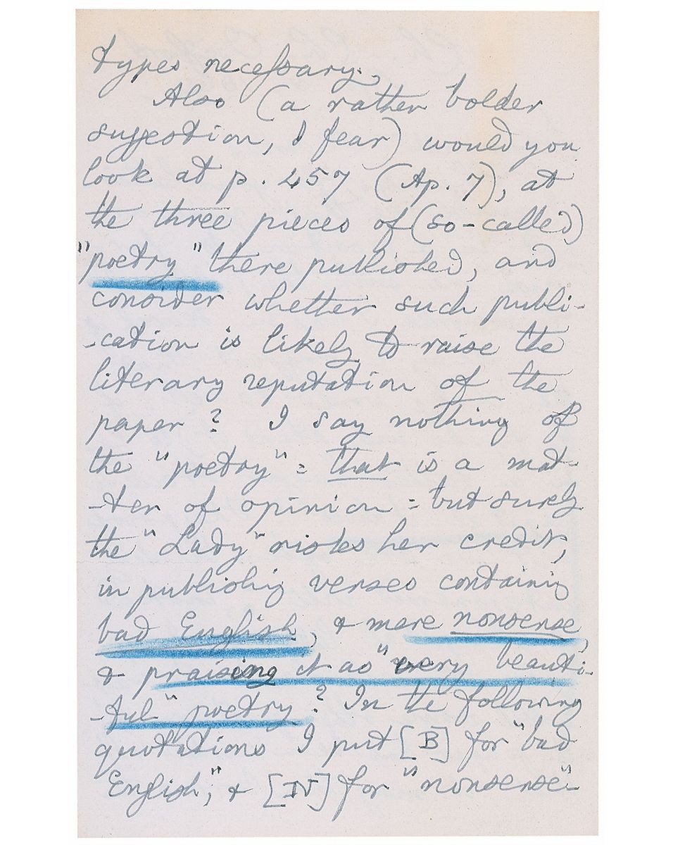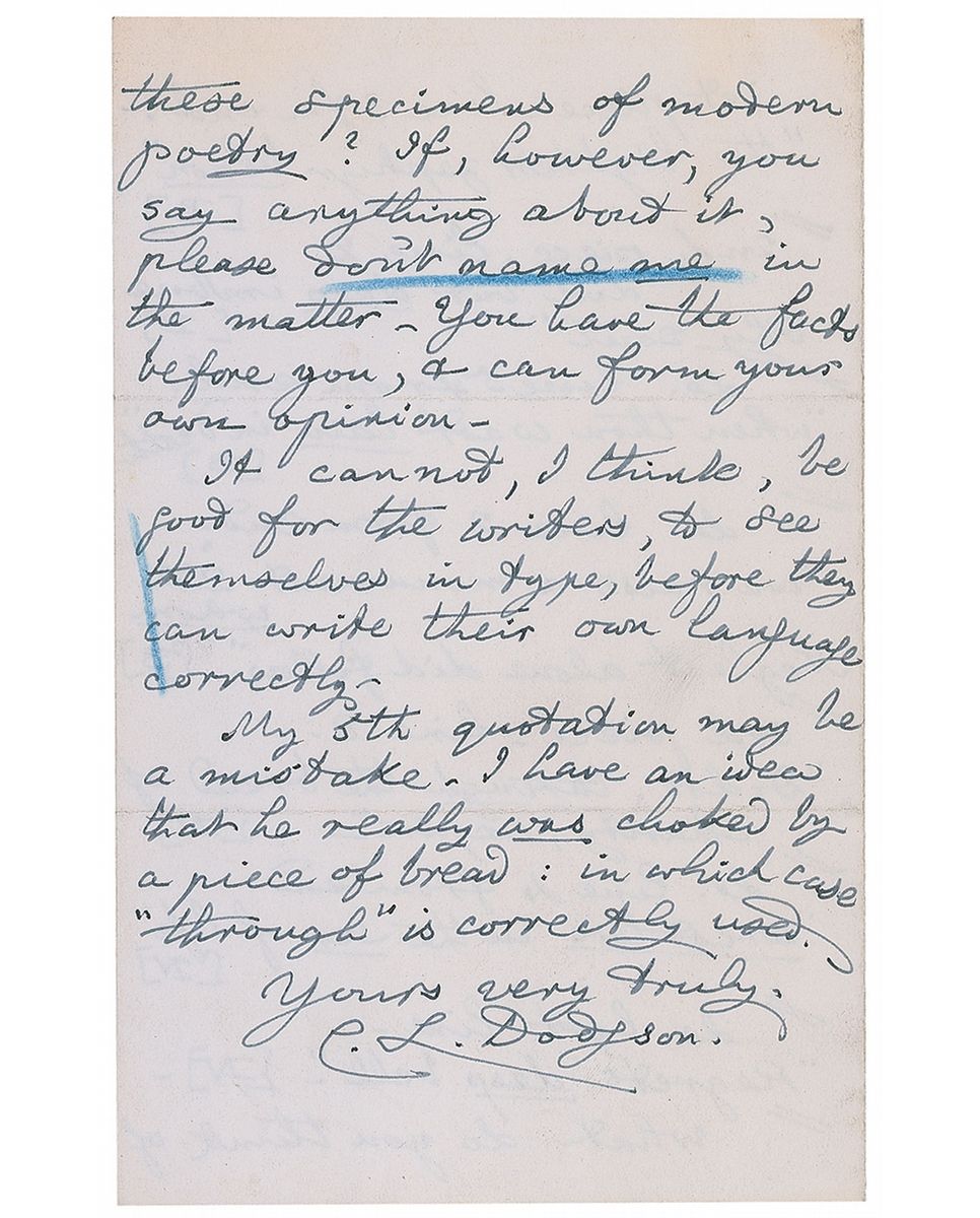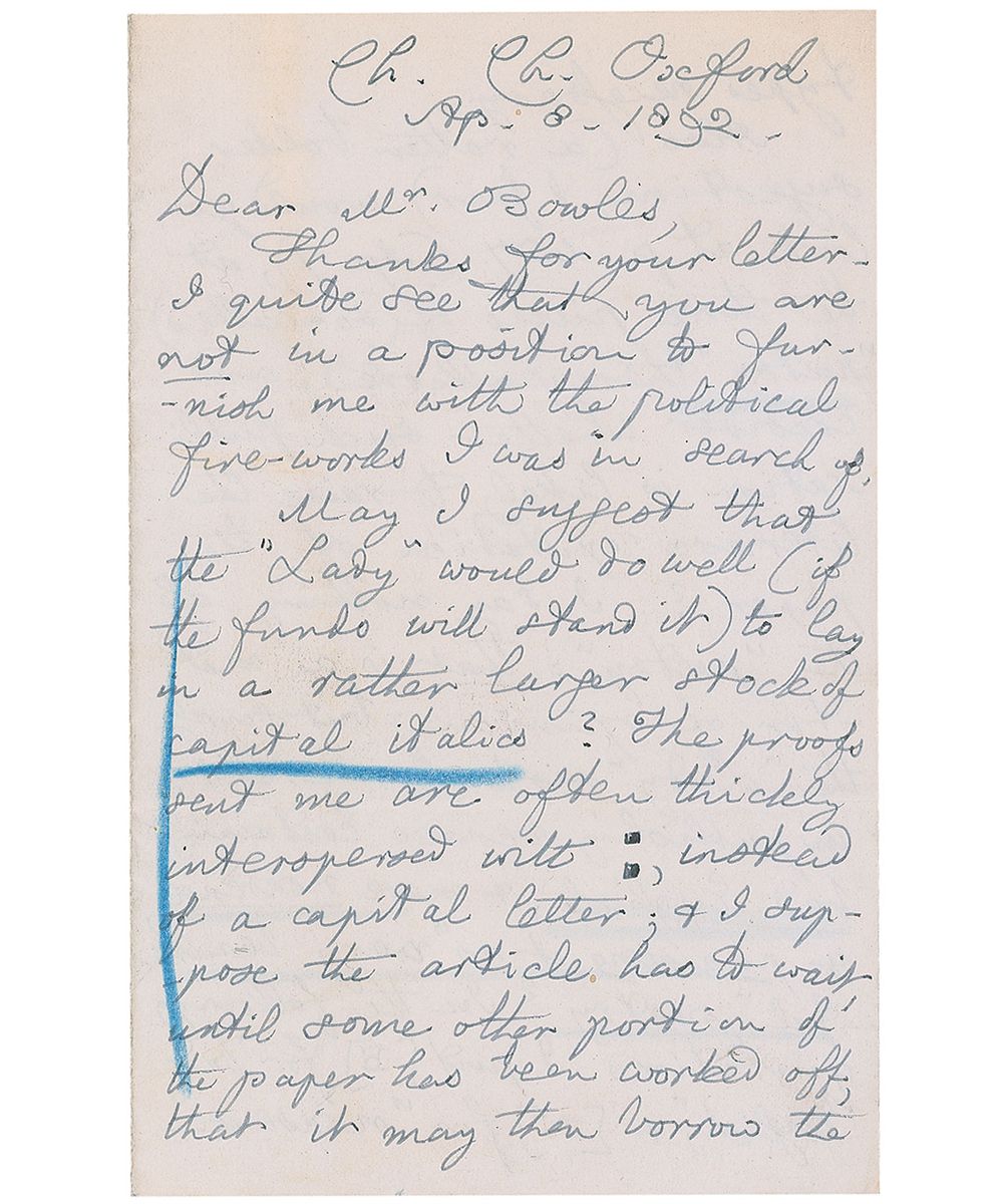 Exquisite ALS signed “C. L. Dodgson,” four pages on two adjoining sheets, 4.5 x 7, April 8, 1892. Letter to Thomas Gibson Bowles, founder and editor of British magazines The Lady and Vanity Fair. In part: “I quite see that you are not in a position to furnish me with the political fire-works I was in search of. May I suggest that the ‘Lady’ would do well (if the funds will stand it) to lay in a rather larger stock of capital italics? The proofs sent me are often thickly interspersed with :, instead of a capital letter, & I suppose the article has to wait, until some other portion of the paper has been worked off, that it may then borrow the types necessary. Also (a rather bolder suggestion, I fear) would you look at p. 457 (Ap. 7), at the three pieces of ‘poetry’ there published, and consider whether such publication is likely to raise the literary reputation of the paper? I say nothing of the ‘poetry’: that is a matter of opinion: but surely the ‘Lady’ risks her credit, in publishing verses containing bad English, & mere nonsense, & praising it as ‘very beautiful’ poetry? In the following quotations I put [B] for ‘bad English,’ & [N] for ‘nonsense’…line 5 from end—‘when thou wast lain in death’ [B]…line 2 from end—‘we raise a monument o’er whom neglect alone did follow’ [B]…What do you think of these specimens of modern poetry?…It cannot, I think, be good for the writers, to see themselves in type, before they can write their own language correctly.” In fine condition, with a few pencil notations (presumably added by the recipient). A remarkable letter demonstrating Dodgson’s keen literary sense and mastery of his craft.