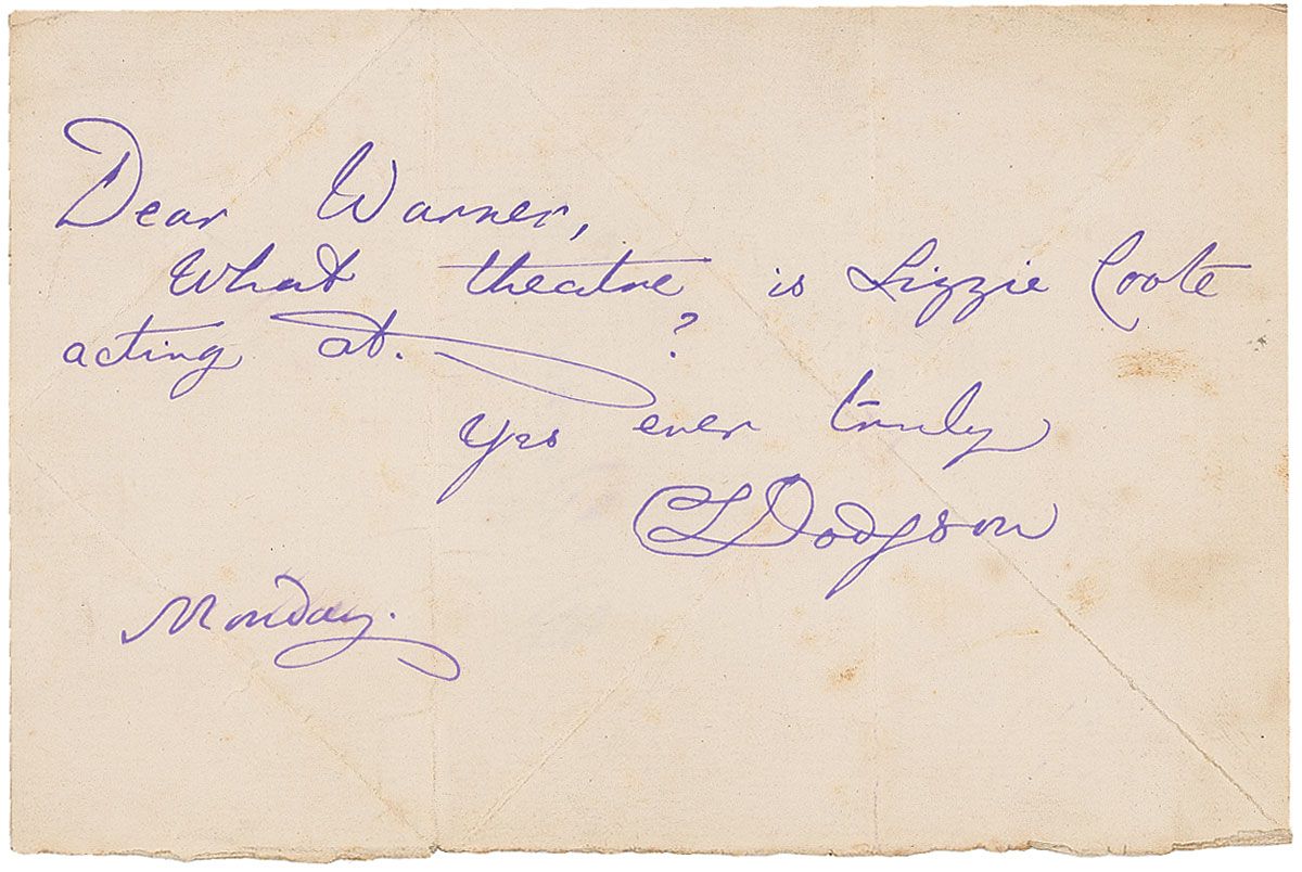 Beloved British author of Alice’s Adventures in Wonderland, better known by his pen name, Lewis Carroll (1832–1898). ANS signed “C. L. Dodgson,” one page, 6 x 4, no date, with “Monday,” written by Dodgson in the lower left corner. Brief note to W. Warner. In full: “What theatre is Lizzie Coote acting at?” On the reverse, Dodgson has addressed the note “W. Warner, Esq.” Several diagonal and vertical folds from folding for transmittal, scattered toning, and a brush to “Monday,” otherwise fine condition.