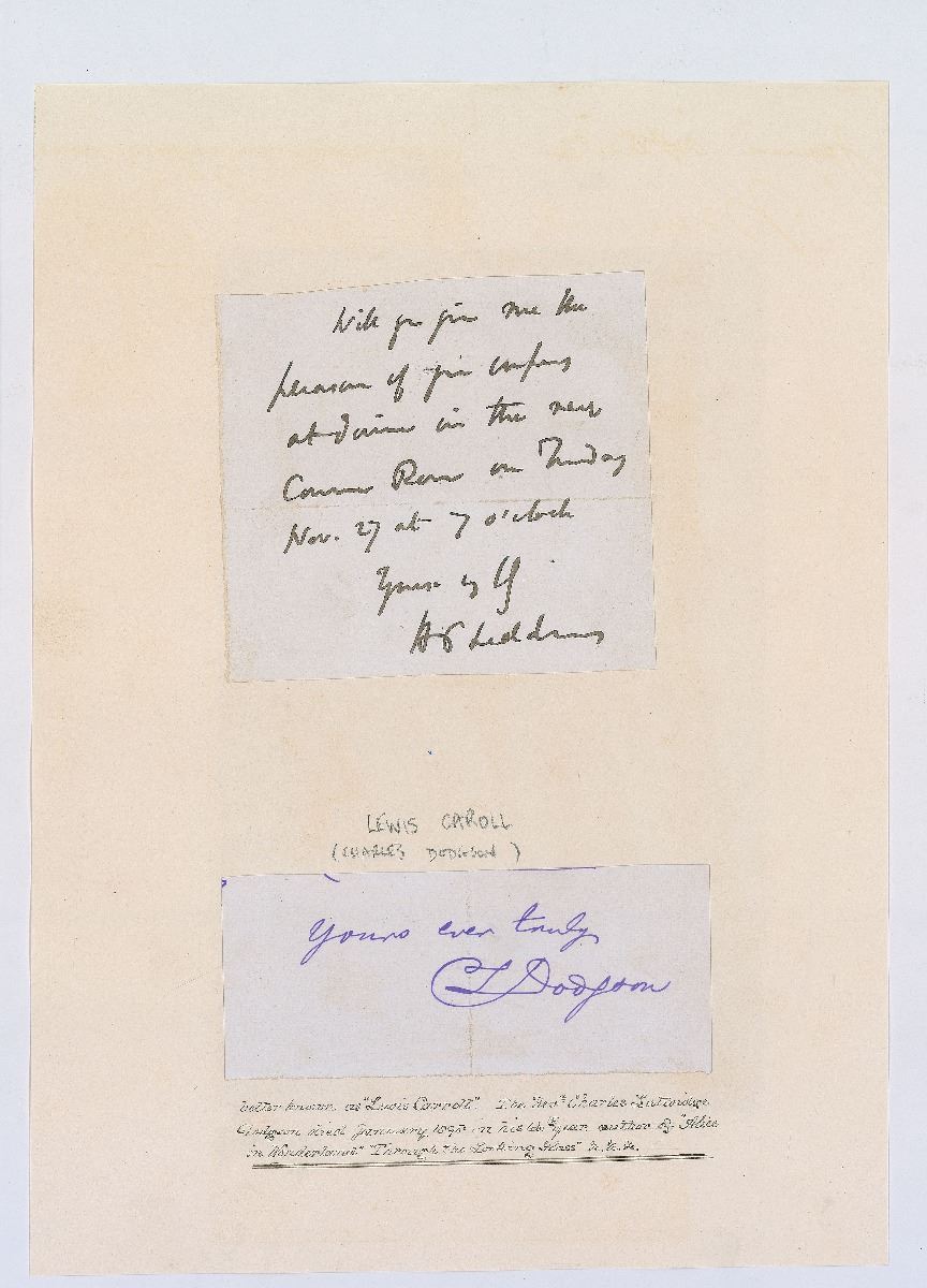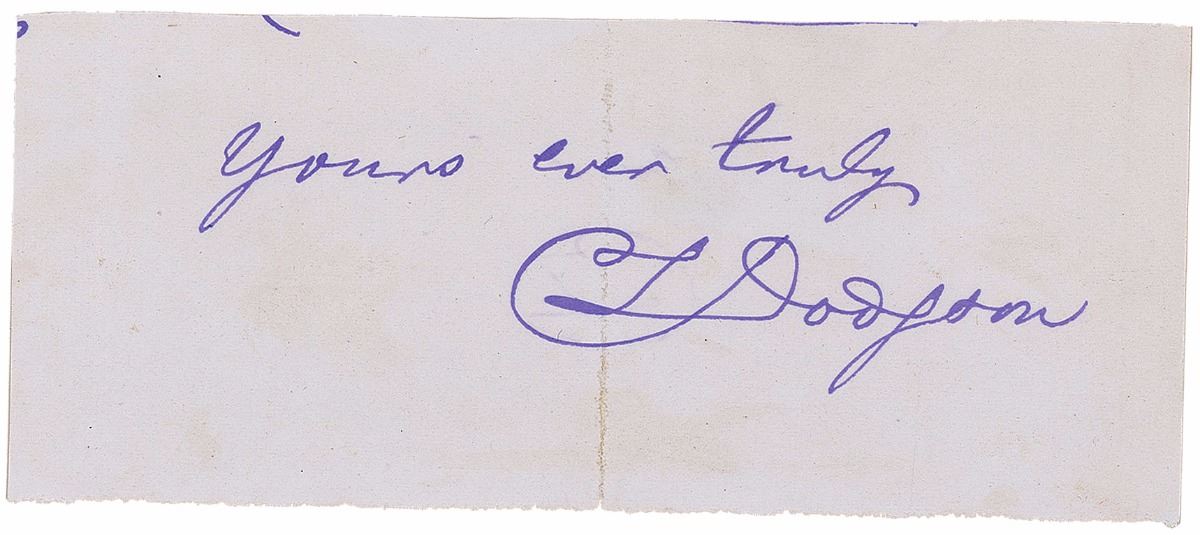 Attractive purple ink signature, “Yours ever truly, C. L. Dodgson,” on an off-white 4.5 x 2 slip affixed to a larger album page. In fine condition, with a central vertical fold passing through the first letter of his signature.