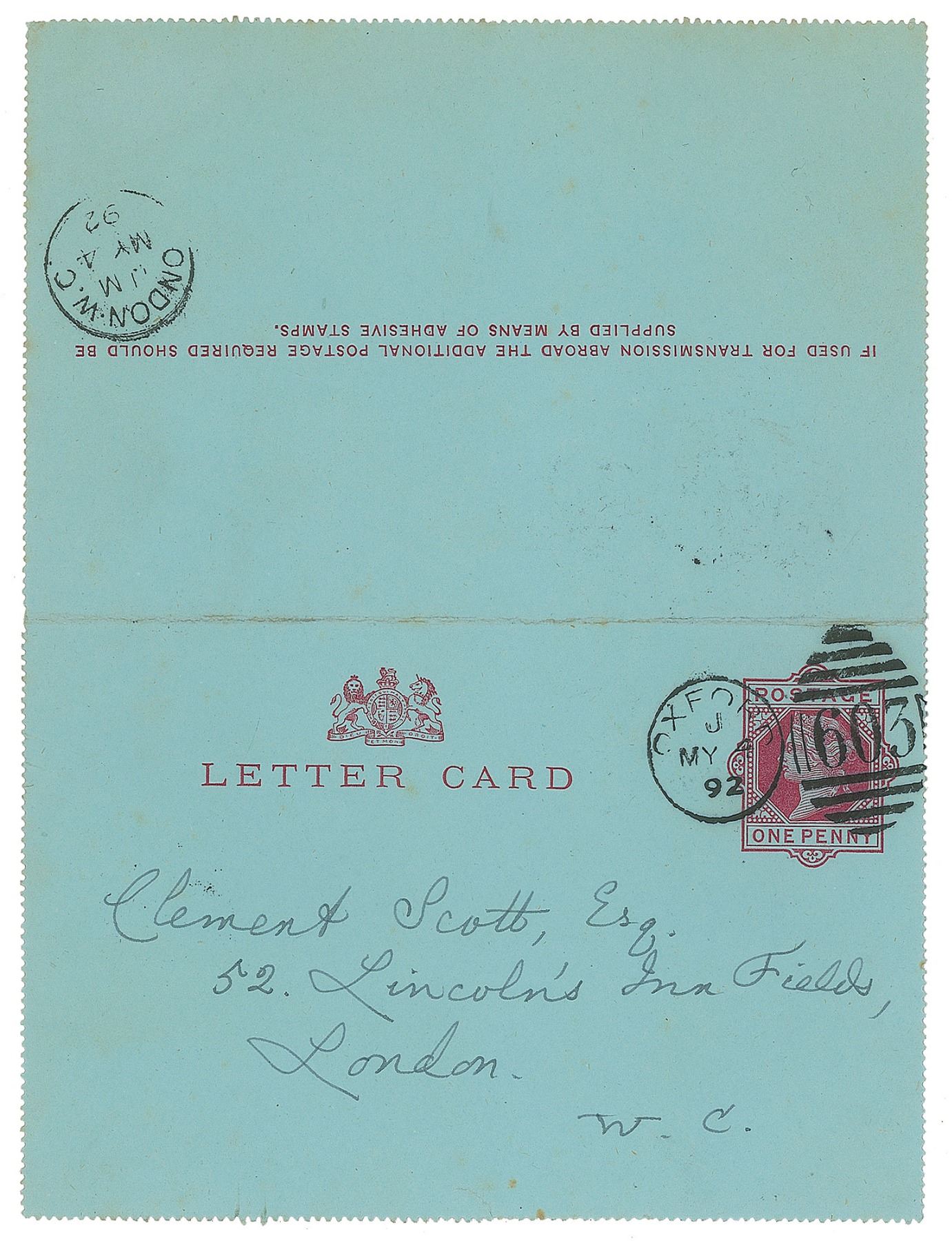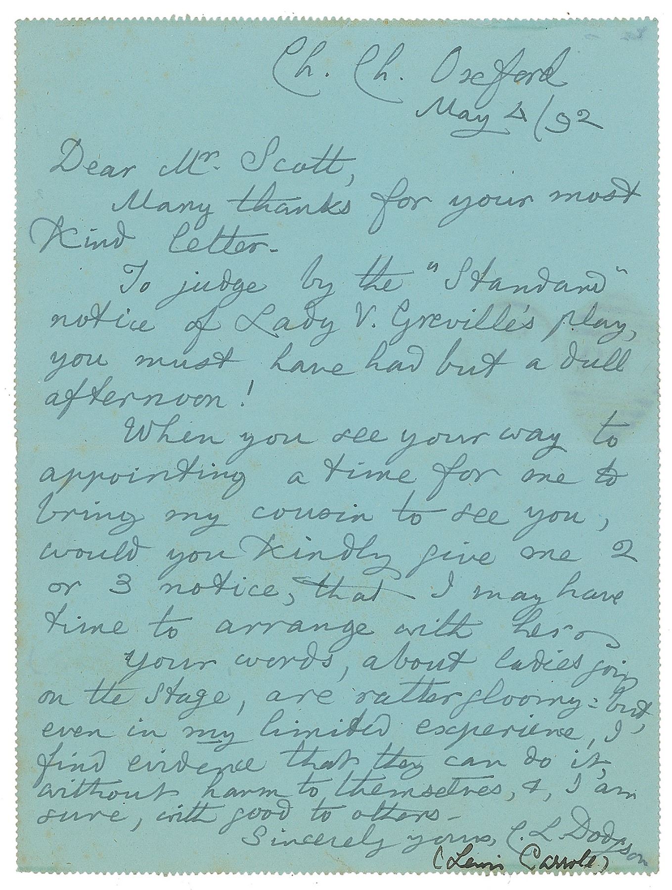 ALS signed “C. L. Dodgson,” one page, 4.75 x 6.25, May 4, 1892. Letter to drama critic Clement Scott, in part: "To judge by the 'Standard' notice of Lady V. Greville's play, you must have had but a dull afternoon! When you see your way to appointing a time for me to bring my cousin to see you, would you kindly give me 2 or 3 notice, that I may have time to arrange with her. Your words, about ladies going on the stage, are rather gloomy: but, even in my limited experience, I find evidence that they can do it, without harm to themselves, &, I am sure, with good to others." Annotated "Lewis Carroll" below the signature in another hand. In fine condition.