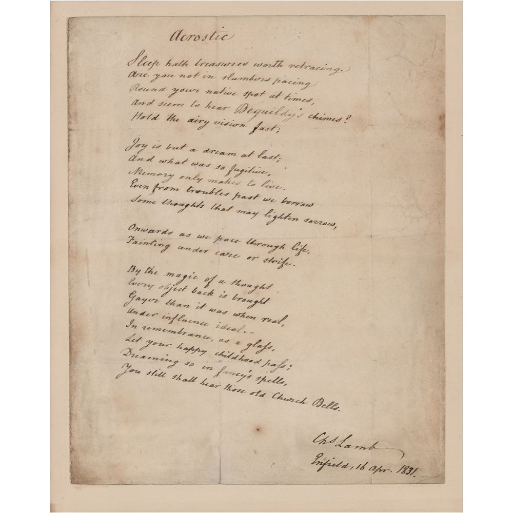Exceptional handwritten acrostic poem by Charles Lamb, who signs at the bottom, “Ch’s Lamb, Enfield, 16 Apr. 1831.†The four-stanza poem, one page, 7.25 x 9, is headed “Acrostic†at the top and, accordingly, spells out the recipient, “To Sarah James of Beguildy,†with the first letter of each successive line. The poem reads: “Sleep hath treasures worth retracing / Are you not in slumbers pacing / Round your native spot at times / And seem to hear Beguildy's chimes? / Hold the airy vision fast; Joy is but a dream at last / And what was so fugitive / Memory only makes to live / Even from troubles past we borrow / Some thoughts that may lighten sorrow / Onwards as we pace through life / Fainting under care or strife / By the magic of a thought / Every object back is brought / Gayer than it was when real / Under influence ideal / In remembrance as a glass / Let your happy childhood pass; / Dreaming so in fancy's spells / You still shall hear those old Church Bells.†Professionally inlaid into a slightly larger sheet. In very good to fine condition, with light creasing, toning, and soiling.