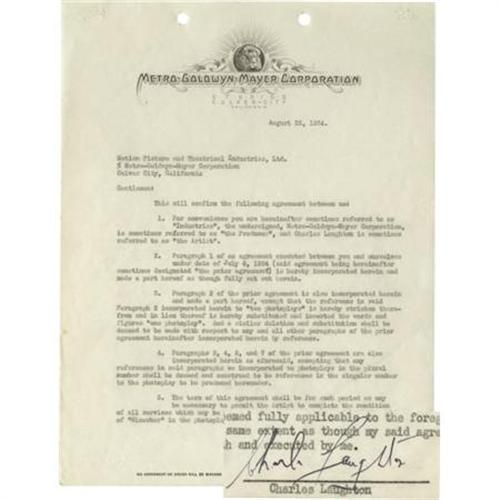 <B>Charles Laughton Signed Contract.</B></I> A three-page agreement on MGM letterhead, dated August 25, 1934, engaging Laughton for the role of "Micawber" in the 1935 production of <I>David Copperfield,</B></I> signed by the actor on the last page in black ink. The role was written for Laughton, but when his performance didn't satisfy director George Cukor, he left the film after one week of filming, and was replaced by comedian and Dickens scholar W.C. Fields. (Laughton's wife, Elsa Lanchester, nonetheless made a cameo appearance as Mr. Micawber's assistant, "Clickett.") In Very Fine condition with mild tanning and wear, staple holes to the upper left corners, and the usual punch holes to the top edge. <I>Accompanied by LOA from PSA/DNA.</B></I><BR><BR><b>Shipping:</b> Flat Material, Small (<a target="_blank" href="http://www.heritageauctions.com/common/shipping.php">view shipping information</a>)