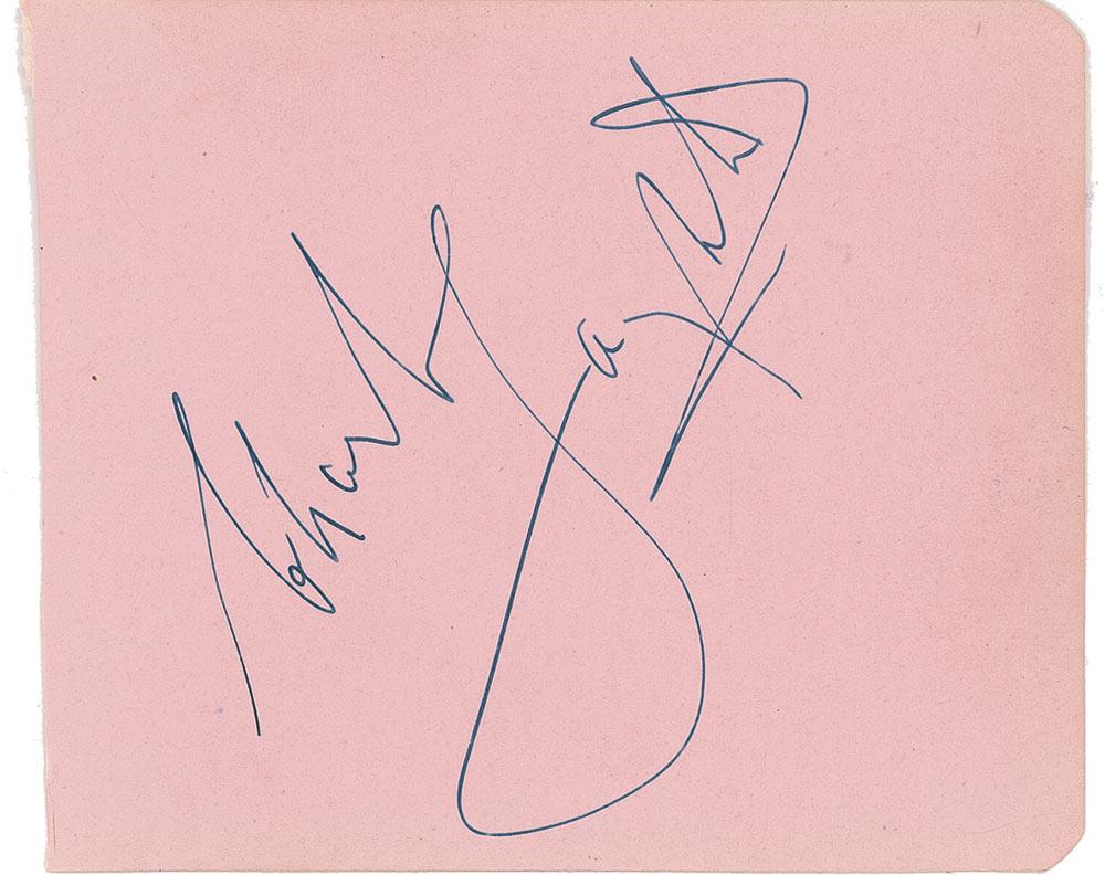 Choice vintage fountain pen signature, “Charles Laughton,” on a pink 5 x 4 album page. In fine condition. Accompanied by a terrific unsigned portrait of Laughton as Captain Bligh, suitable for matting.
