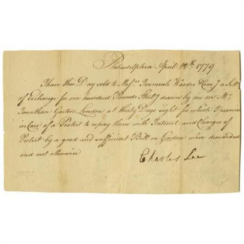 <B>Charles Lee Manuscript Document Signed</B></I> <I>"Charles Lee,"</B></I> one page, 8" x 4.75". Philadelphia, April 12, 1779. In full, <I>"I have this Day sold to Messr Jeremiah Warden & Comy a Sett of Exchange for one hundred Pounds Sterlg drawn by me on Mr. Jonathan Gaston London at thirty Days sight for which I promise in Case of a Protest to repay them with Interest and Charges of Protest by a good and sufficient Bill on London when demanded and not otherwise."</B></I> On verso is an endorsement by Jeremiah Warden & Company dated October 19, 1779. This financial document was signed by Lee exactly eight months after being court-martialed in August 1778 for disobeying General Washington's orders to attack during the the Battle of Monmouth. Lee continued to openly criticize Washington and was dismissed from the army on January 10, 1780. The document bears folds and is slightly nicked at edges. Overall, it's in fine condition.<BR><BR><BR><b>Shipping:</b> Flat Material, Small (<a target="_blank" href="http://www.heritageauctions.com/common/shipping.php">view shipping information</a>)