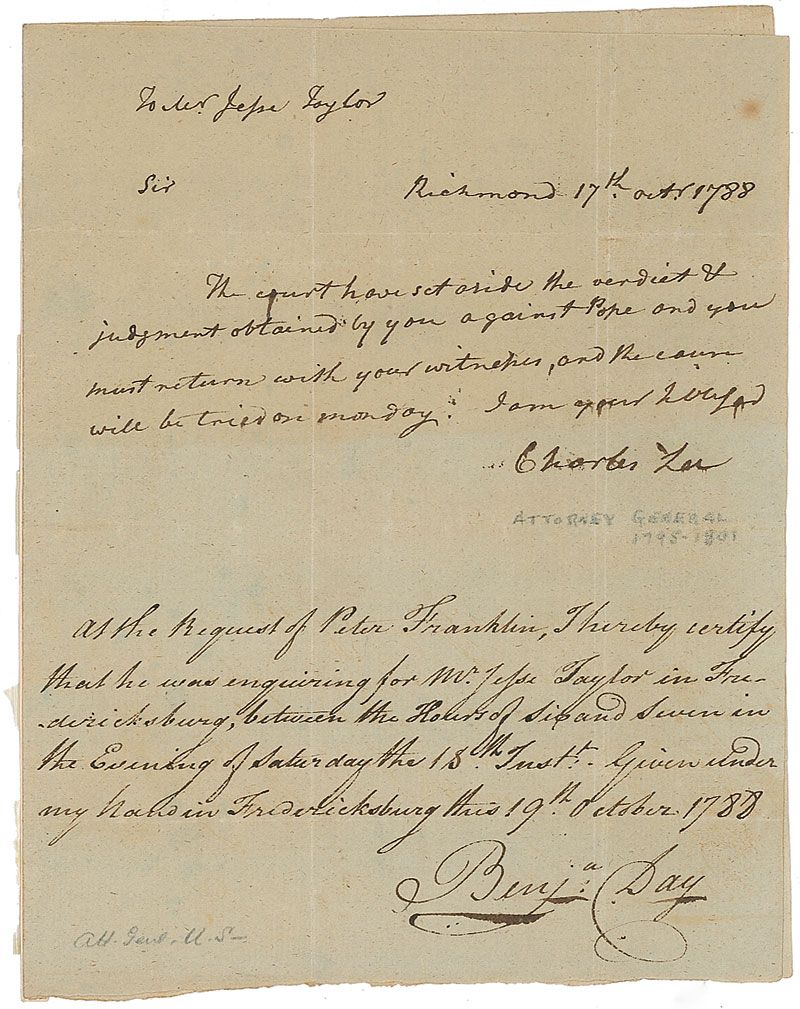 ALS, signed “Charles Lee,” one page, 6 x 7.5, October 17, 1788. Letter to Jess Taylor reads, in part: “The court has set aside the verdict & judgement obtained by you against Pope and you must return with your witness, and the case will be retried on Monday.” An endorsement from Day is written underneath the letter, signed “Benjn. Day,” and dated October 19, 1788. In very good condition, with intersecting folds, one through a single letter of both signatures, scattered mild toning, and a couple of pencil notations.
