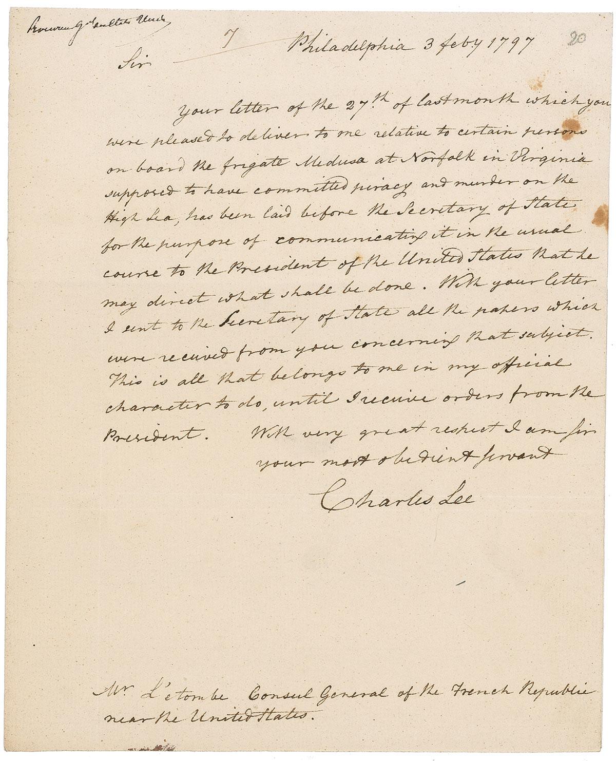 British soldier turned Virginia planter (1732-1782) who was a general officer of the Continental Army in the American Revolutionary War. Lee is most notorious for his actions during the Battle of Monmouth. Washington needed a secondary commander to lead the frontal assault. He unwillingly chose to put Lee in charge as he was the eldest of his generals. Washington ordered him to attack the retreating enemy, but instead, Lee ordered a retreat. He retreated directly into Washington and his troops, who were advancing, and Washington dressed him down publicly. Lee responded with "inappropriate language," was arrested, and shortly thereafter court-martialed. Lee was found guilty, and he was relieved of command for a period of one year. ALS, one page, 7.25 x 9, February 3, 1797. Letter to the French Consul General. In full: “Your letter of the 27th of last month which you were pleased to deliver to me relative to certain persons on board the frigate Medusa at Norfolk in Virginia supposed to have committed piracy and murder on the High Sea, has been laid before the Secretary of State for the purpose of communicating it in the usual course to the President of the Uniteed States that he may direct what shall be done. With your letter I sent to the Secretary of State all the papers which were received from you concerning that subject. This is all that belongs to me in my official character to do, until I receive orders from the President.” In fine condition, with a few light spots to top right, and missing top portion of second integral page. RRAuction COA.