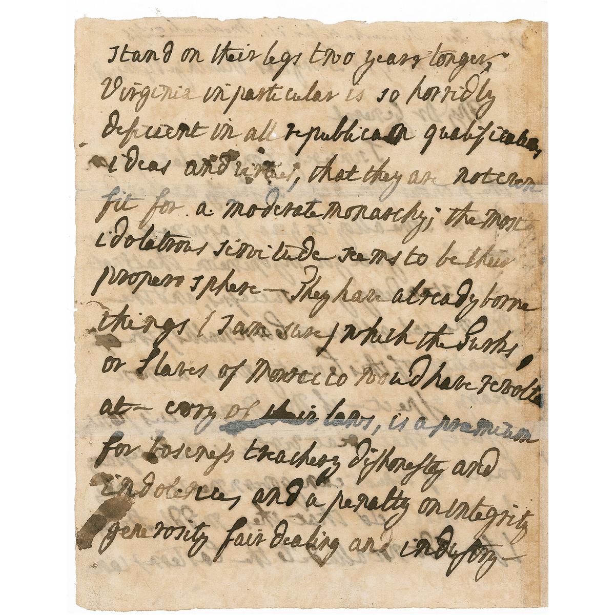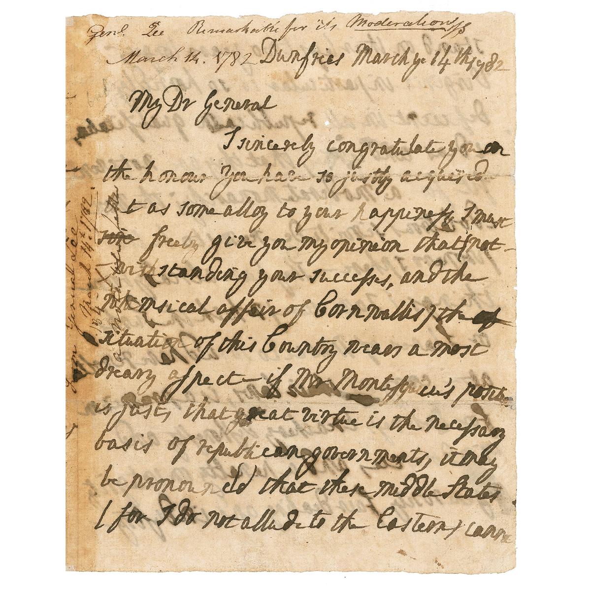 Dismissed from the army and living penniless at his undeveloped estate in Virginia, the general here briefly compliments General Greene on a victory in South Carolina...but quickly turns to a condemnation of his home state. “They have already borne things (I am sure) which the Turks, or Slaves of Morocco wou’d have revolted at – every [?] of their laws, is a premium for baseness treachery dishonesty and indolence, and a penalty on integrity generosity fair dealing and industry,” he rants. Even so, Lee was still a revolutionary and Republican who hated slavery. As stated in the letter: “Virginia in particular is so horridly deficient in all republican qualifications, ideas and wishes, that they are not even fit for a moderate monarchy.” An amazingly vitriolic letter from a disgraced leader who would be dead seven months later.
