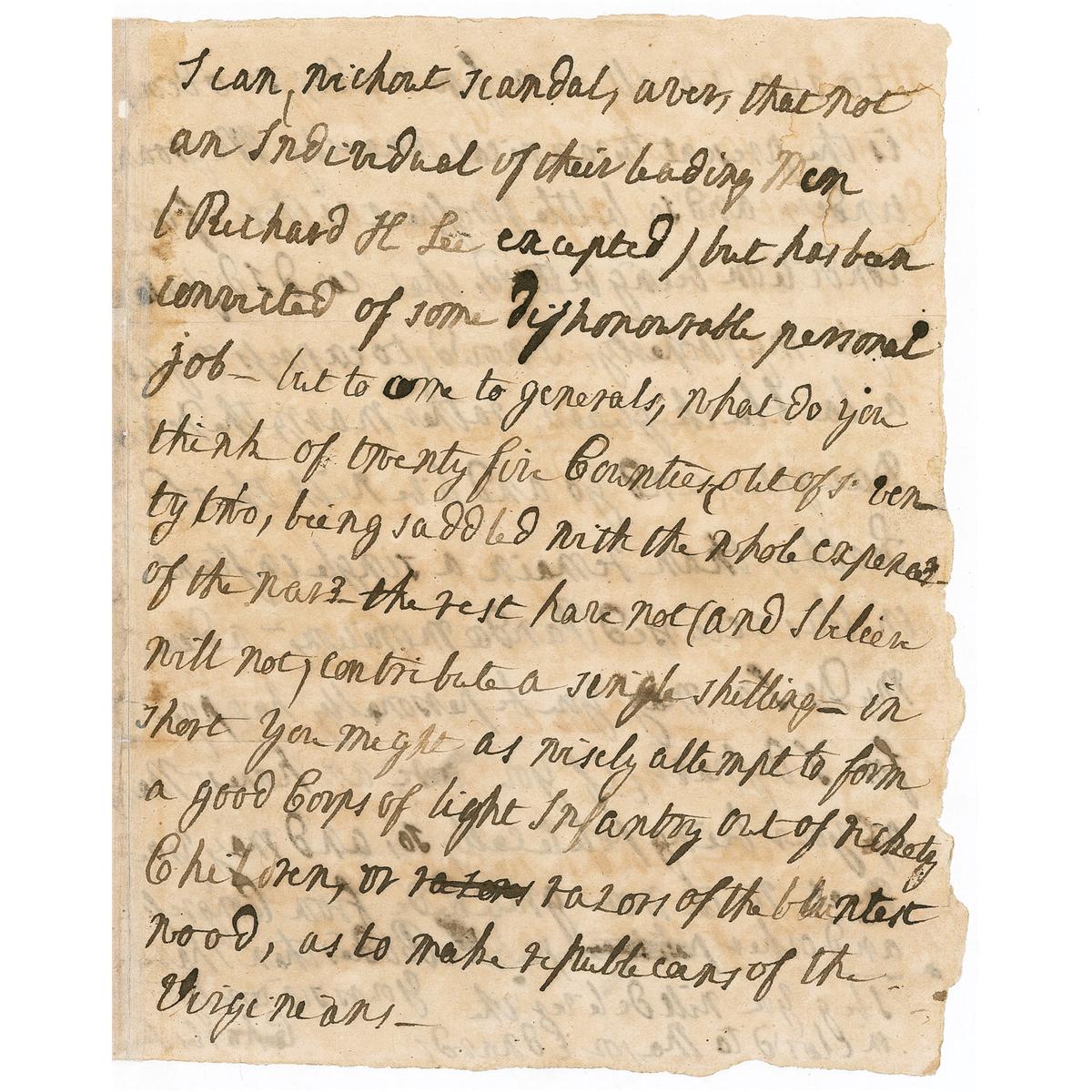 British soldier turned Virginia planter (1732-1782) who was a general officer of the Continental Army in the American Revolutionary War. Lee is most notorious for his actions during the Battle of Monmouth, where he disobeyed orders from George Washington and retreated directly into the general and his advancing troops, earning Lee a public rebuke. Lee responded with ‘inappropriate language,’ was court-martialed, and relieved of command for one year. Revolutionary War-dated ALS, four pages on two adjoining sheets, 6.25 x 8, March 14, 1782. Letter to General Nathanael Greene. In full: “I sincerely congratulate you on the honour you have so justly acquired but as some alloy to your happiness I must freely give you my opinion that (notwithstanding your success, and the non-whimsical affair of Cornwallis) the situation of this Country wears a most dreary aspect – if Mr. Montesquieu’s position is just, that great virtue is the necessary basis of republican governments, it may be pronounc’d that these middle States (for I do not allude to the Eastern) cannot stand on their legs two years longer, Virginia in particular is so horridly deficient in all republican qualifications, ideas and wishes, that they are not even fit for a moderate monarchy; the most idolatrous servitude seems to be their proper sphere. They have already borne things (I am sure) which the Turks, or Slaves of Morocco wou’d have revolted at – every [?] of their laws, is a premium for baseness treachery dishonesty and indolence, and a penalty on integrity generosity fair dealing and industry. I can, without scandal, aver, that not an individual of their leading Men (Richard H. Lee excepted) but has been convicted of some dishonourable personal job – but to come to generals, what do you think of twenty five Counties, out of seventy two, being saddled with the whole expense of the war? The rest have not (and I believe will not) contribute a single shilling – in short you might as wisely attempt to form a good Corps of light infantry out of rickety Children, or razors of the bluntest wood, as to make republicans of the Virginians.