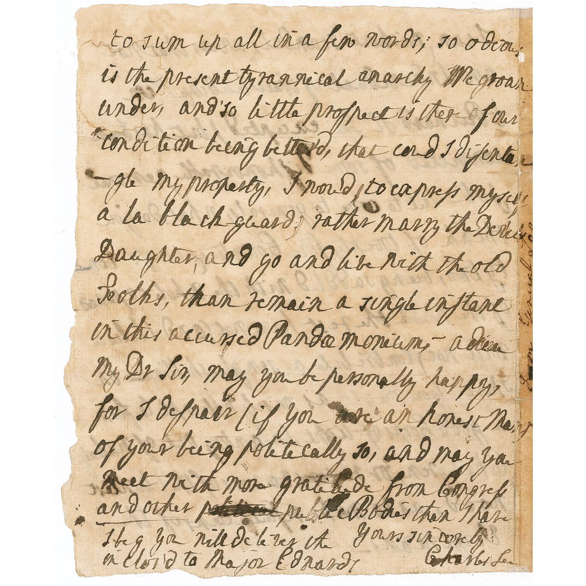 To sum up all in a few words; so odious is the present tyrannical anarchy We groan under, and so little prospect is there of our condition being better’d, that coud I disentangle my property, I wou’d, (to express myself a la black-guar) rather marry the Devil’s Daughter, and go and live with the old Folks, than remain a single instant in this accursed Pandemonium. –Adieu My Dr. Sir, may you be personally happy, for I despair (if you are an honest Man) of your being politically so, and may you meet with more gratitude from Congress and other public Bodies than I have.”