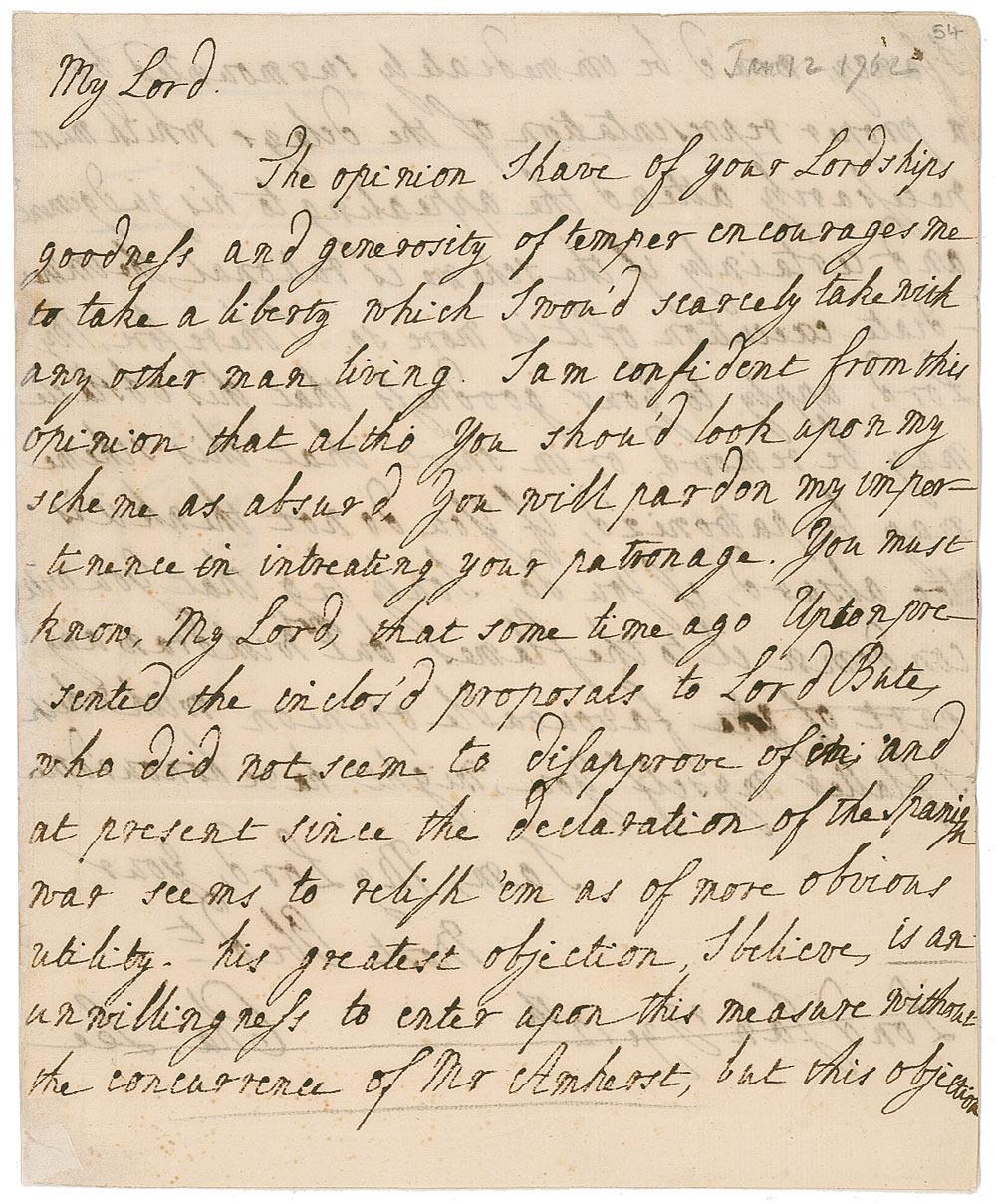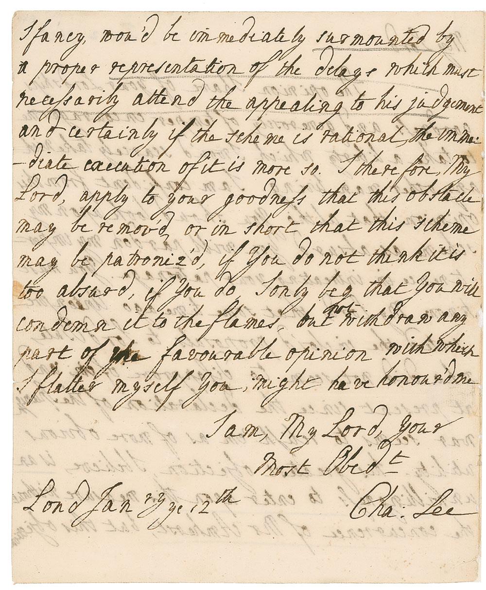 British soldier turned Virginia planter (1732-1782) who was a general officer of the Continental Army in the American Revolutionary War. Lee is most notorious for his actions during the Battle of Monmouth, where he disobeyed orders from George Washington and retreated directly into the general and his advancing troops, earning Lee a public rebuke. Lee responded with ‘inappropriate language,’ was court-martialed, and relieved of command for one year. ALS signed “Cha. Lee,” one page, both sides, 7.25 x 9, January 12, 1762. Letter to the Earl of Shelbourne. In full: “The opinion I have of your Lordships goodness and generosity of temper encourages me to take a liberty which I would scarcely take with any other man living. I am confident from this opinion that altho you should look upon my scheme as absurd, you will pardon my impertinence in entreating your patronage. You must know, My Lord, that some time ago Upton presented the enclosed proposals to Lord Bute [John Stuart, 3rd Earl of Bute, (1713-1792), was a Scottish nobleman who served as Prime Minister of Great Britain (1762–1763) under George III, and was arguably the last important favorite in British politics], who did not seem to disapprove of, and at present since the declaration of the Spanish war seems to relish ‘em as of more obvious utility. His greatest objection…is an unwillingness to enter upon this measure without the concurrence of Mr. Amherst, but this objection I fancy, wou’d be immediately surmounted by the proper representation of the delays which must necessarily attend the appealing to his judgement and certainly if the scheme is rational, the immediate execution of it is more so. Therefore, my Lord, apply to your goodness that this obstacle may be remov’d or in short that this scheme be patronized, if you do not think it is absurd, if you do I only beg that you will condemn it to the flames but not withdraw any part of the favourable opinion with which I flattered myself you might have honoured me.” Second integral page bears an address panel to Shelbourne, as well as docketing in another hand reading “Major Lee with a proposal for raising a regiment in N. America.” Professional archival reinforcement along hinge, as well as a bit of paper loss, intersecting folds, some mild toning, and show-through from writing on opposing sides, otherwise fine condition. Lee served as a lieutenant colonel in the Portuguese army during the 1762 Spanish invasion of Portugal. In this correspondence, Lee—still a loyal British officer who associated himself with many of the British leaders and members of the elite class in London—seeks permission from Great Britain’s prime minister to raise a regiment of colonists to fight the Spanish in Portugal. The British government—one he’d eventually fight against—agreed to dispatch a small army to assist Portugal in driving out the invading Spaniards, with Lee receiving an honorable mention for personal gallantry in action. Even before siding with the fledgling nation in war as one of its top generals, Lee sided with them on principal following a conflict between Native American tribes and American colonists, courting the displeasure of the British government. A fascinating piece of correspondence from the revolutionary who helped win America’s freedom.