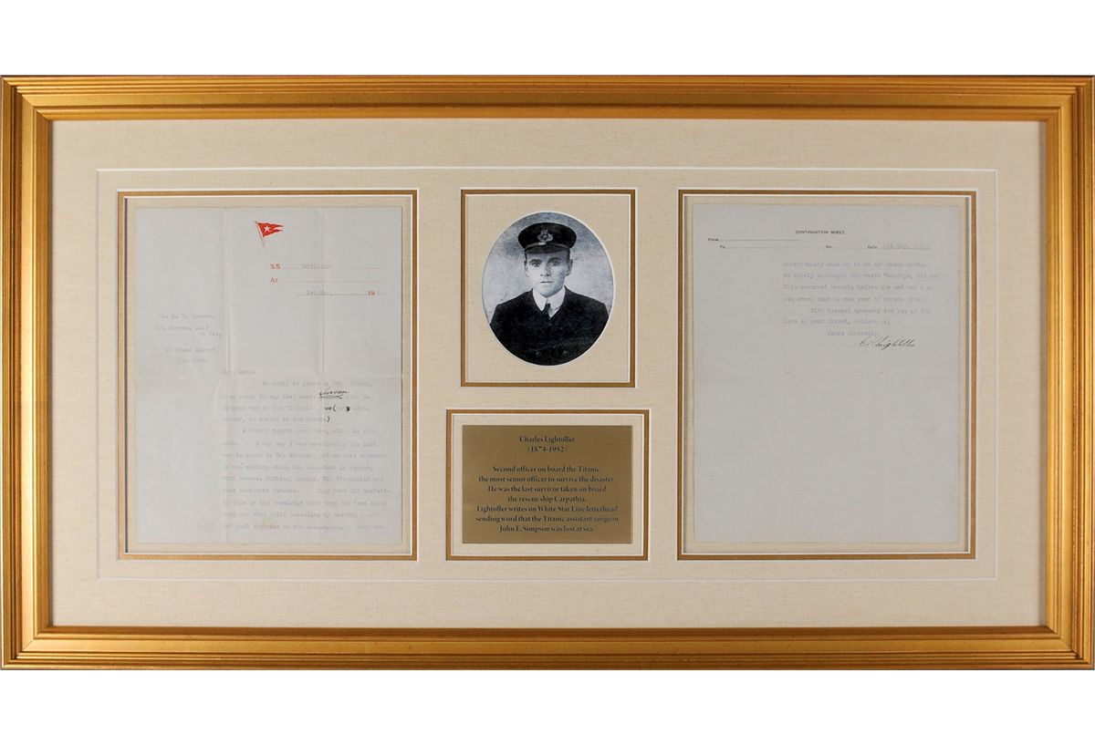 I deeply regret your loss, which is also mine. I may say I was practically the last man to speak to Dr. Simpson, and on this occasion he was walking along the boat-deck in company with Messrs. McElroy, Barker, Dr. O’Loughlin and four assistant pursers. They were all perfectly calm in the knowledge that they had done their duty and were still assisting by showing a calm and cool exterior to the passengers. Each one individually came up to me and shook hands. We merely exchanged the words ‘Goodbye, old man.’ This occurred shortly before the end and I am not aware that he was seen by anyone after. With deepest sympathy for you in the loss of your friend.” Beautifully archivally triple-cloth-matted and framed with a photo of Lightoller and descriptive plaque to an overall size of 32 x 17.5. In fine condition, with intersecting folds, one through a single letter of signature, a few light wrinkles and creases, and a couple spots of light toning.