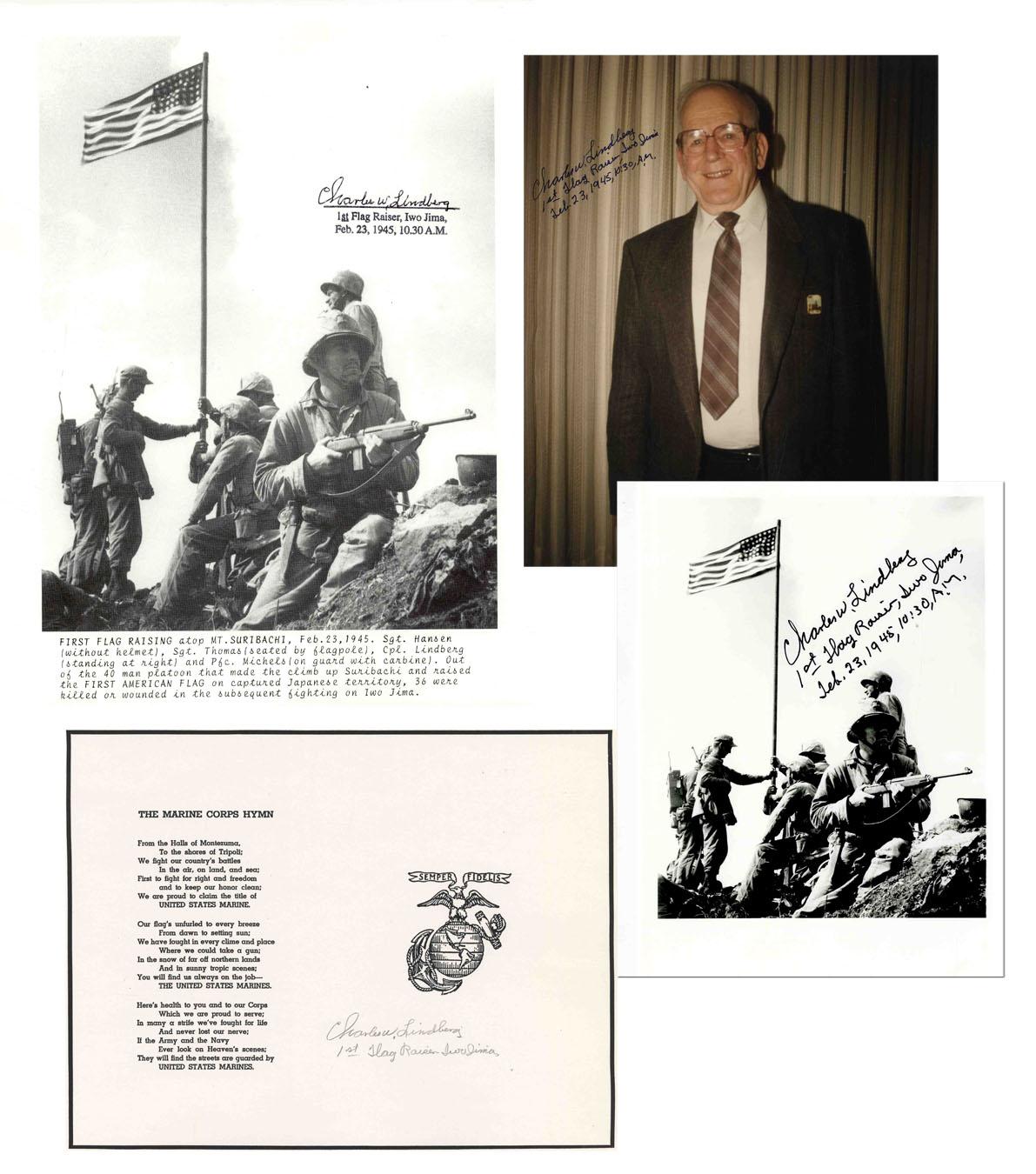 Nice lot of four items signed by WWII Marine hero Chuck Lindberg, who participated in the first Iwo Jima flag raising and was the last surviving member of both flag raisings. Lot includes (1) semi-matte 5'' x 7'' signed photo of the first flag raising (the Joe Rosenthal captured image was actually the second American flag raising on Iwo Jima); (2) semi-matte 8'' x 10'' signed photo of Lindberg later in life; (3) 8.5'' x 11'' ''Marine Corps Hymn'' signed in pencil; (4) 8.5'' x 11'' signed copy of the first flag raising on cardstock paper. Fine.