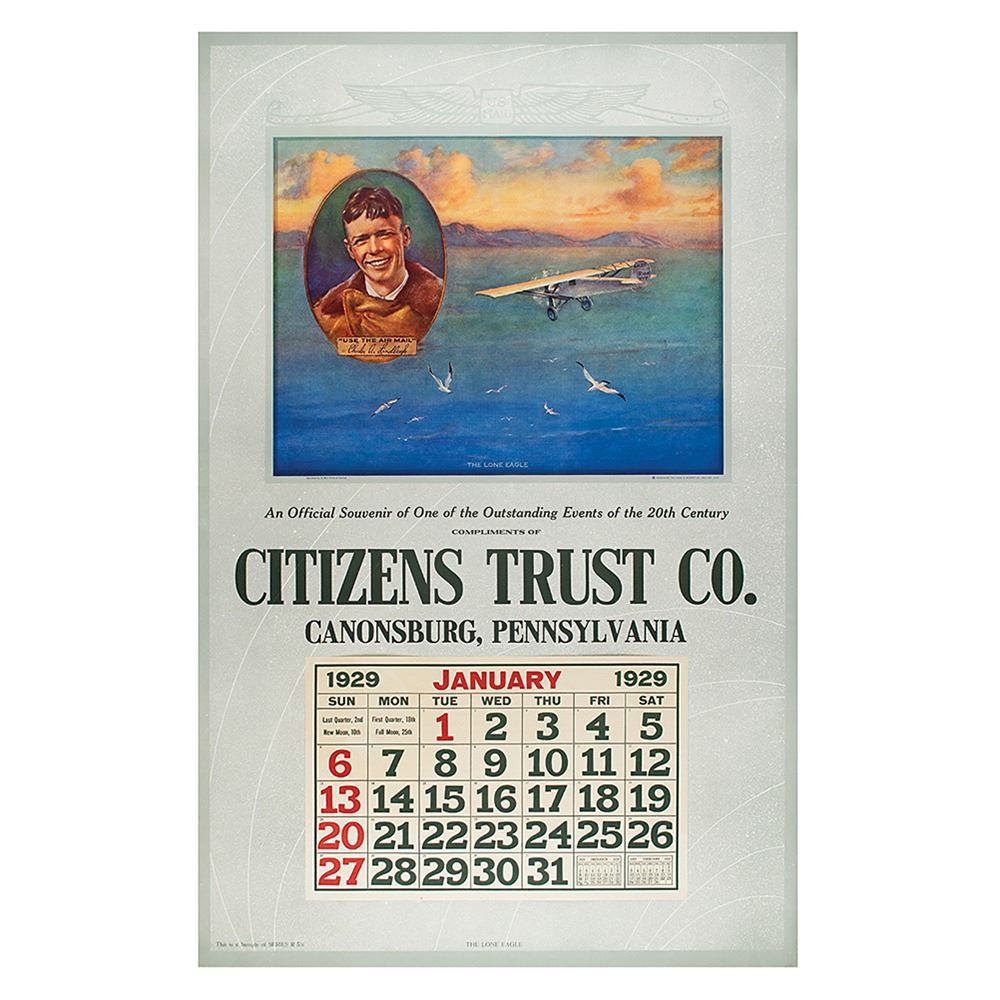 Colorful oversized 21.5 x 33.5 salesman's sample of a calendar for January 1929 entitled 'The Lone Eagle,' featuring a fantastic portrait of Lindbergh set against an artistic rendering of his 'Spirit of St. Louis' plane in flight over the Atlantic Ocean. Printed by the Thos. D. Murphy Co., Red Oak, Iowa. In fine condition.
