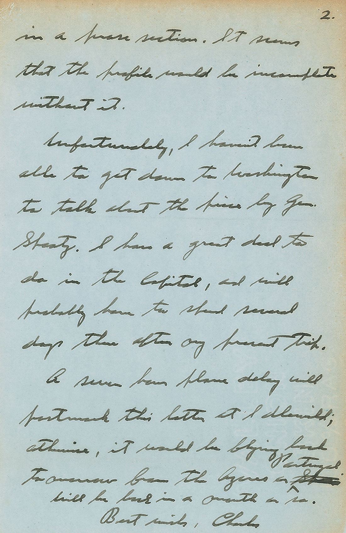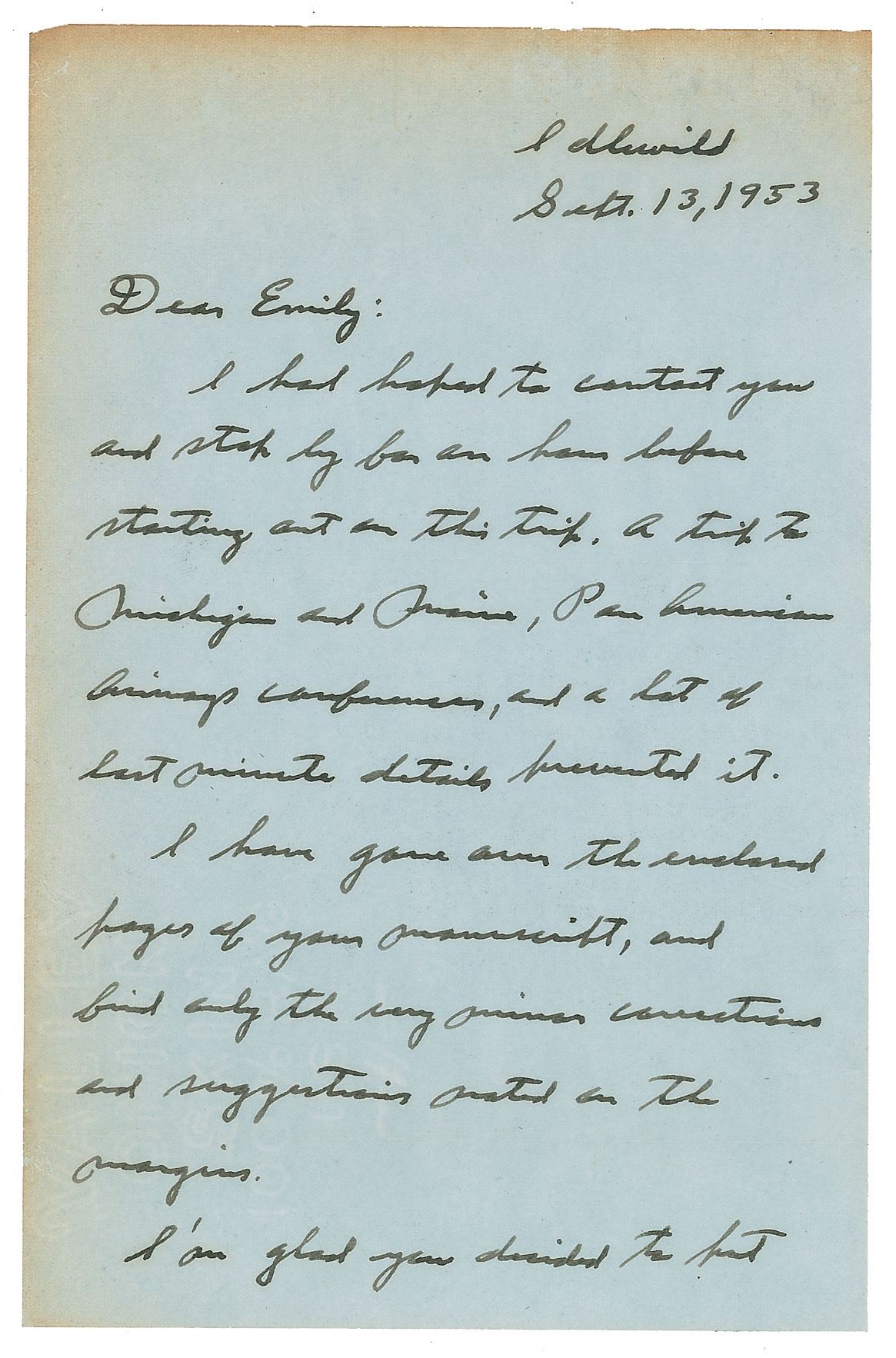 ALS signed “Charles,” two onionskin pages, 5.5 x 8.5, September 13, 1953. Letter to "Emily," written from "Idlewild." In part: "I had hoped to contact you and stop by an hour before starting out on this trip, a trip to Michigan and Maine, Pan American Airways conferences, and a lot of last minute details prevented it. I have gone over the enclosed pages of your manuscript, and find only the very minor corrections and suggestions noted on the margins. I'm glad you decided to put in a prose section. It seems that the profile would be incomplete without it. Unfortunately, I haven't been able to get down to Washington…I have a great deal to do in the Capital, and will probably have to spend several days there after my present trip. A seven hour plane delay will postmark this letter at Idlewild; otherwise, it would be flying back tomorrow." In fine condition, with light toning to edges.
