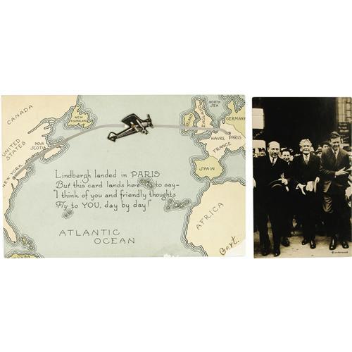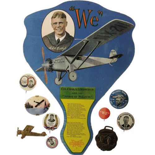 <B>Outstanding Charles Lindbergh Collection of Twelve Items.</B></I> An exceptional grouping, including some quite unusual items. All are in nice condition. <BR><BR><B>1).</B></I> Unique convex oval brooch, hand painted on ivory, showing the New York skyline, Eiffel Tower, and the "Spirit of St. Louis" flying between them. Minor surface rubbing. We cannot recall seeing this item before. 1.75" x 1.4". <BR><B>2).</B></I> Great mechanical card, measuring 8" x 5". Movable "Spirit of St. Louis" follows a track between New York and Paris. There is back damage from previous mounting, and minor paper loss at lower right-hand corner. <BR><B>3).</B></I> Rare brass watch fob, "Commemorating Cleveland's Welcome to Col. Charles A. Lindbergh." Pictures Lindy and presumably Cleveland's mayor with his famed plane in the background. Diameter 1.75". <BR><B>4).</B></I> Colorful cardboard fan, with advertising for Warren, Pennsylvania hardware store on reverse side. 8" x 11". <BR><B>5).</B></I> Scarce 1 1/4" button promoting his book, <I>We,</B></I> with Lindy and "We" in flag-draped ovals. <BR><B>6).</B></I> Unusual red and white 7/8" "We" button. <BR><B>7).</B></I> Scarce brass pin in form of his plane marked, "Spirit of St. Louis. N.Y. to Paris May 21, 1927." 2" x 1". <BR><B>8).</B></I> Uncommon blue litho 1 1/2" button proclaiming "Welcome Home Slim." Choice, virtually mint example. <BR><B>9).</B></I> 1 1/4" "Plucky Lindy" button with lucky horseshoe. <BR><B>10).</B></I> Another red, white, and blue "Plucky Lindy" 1 1/4" button. <BR><B>11).</B></I> Red, white, and blue 7/8" "Welcome Lindy" button. <BR><B>12).</B></I> Second-generation Underwood photo of Lindbergh shortly after his Paris landing. <BR><BR>Total individual retail value on this fine collection is around $800.