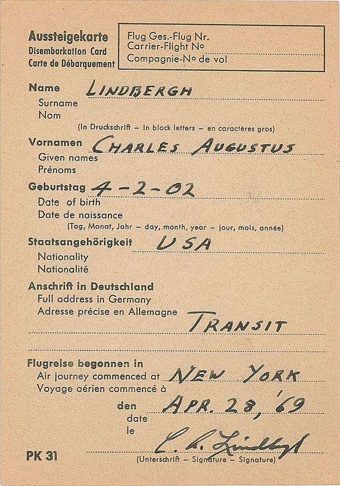 DS, signed “C. A. Lindbergh,” one page, 4 x 5.75, April 28, 1969. German disembarkation card filled out in fountain pen by Charles Lindbergh and signed at the conclusion. Lindbergh lists his surname, ("Lindbergh"), given names ("Charles Augustus"), date of birth (4–2–02"), nationality ("USA"), German address ("Transit"), and the start of his journey ("New York"). In fine condition.