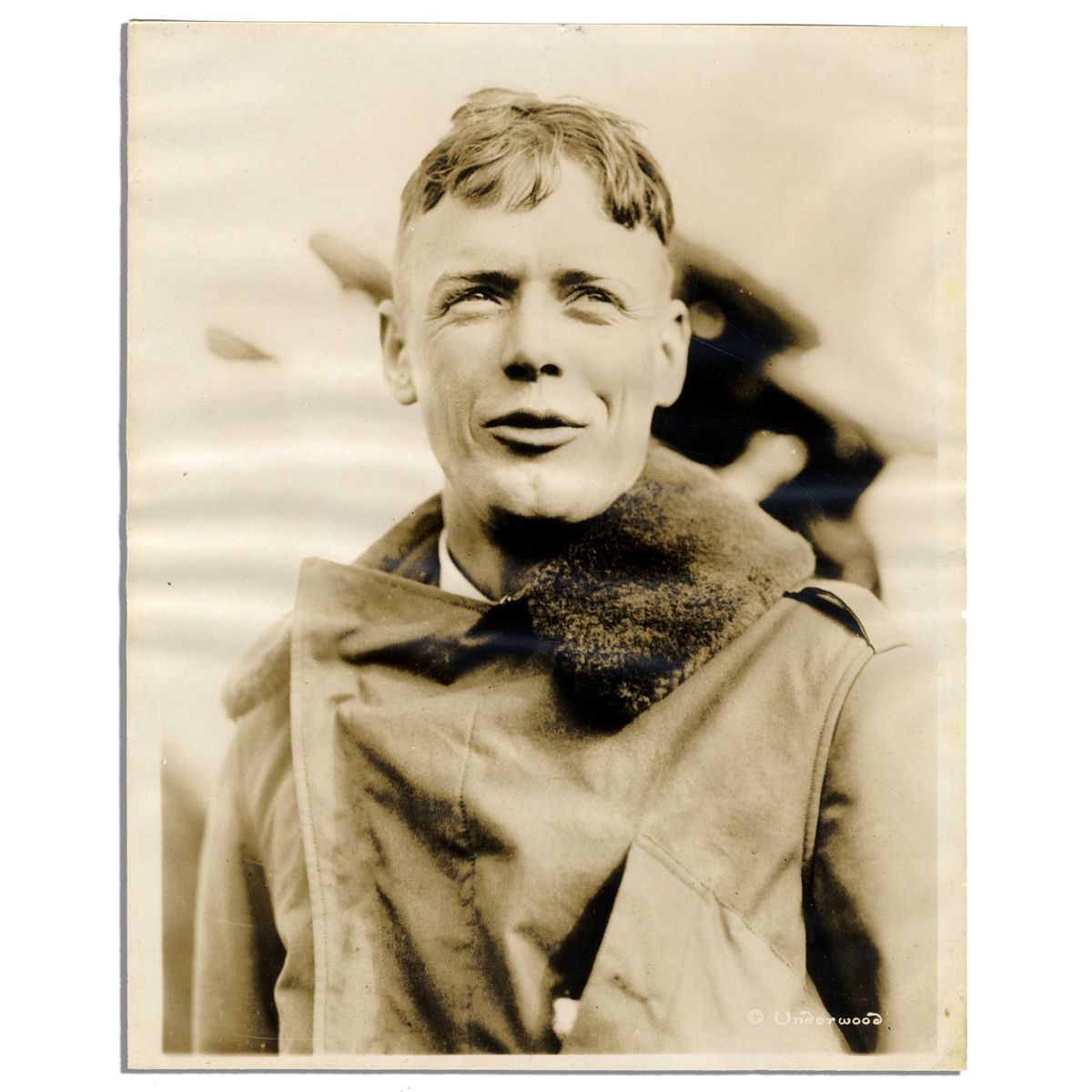Nice 8'' x 10'' glossy sepia-toned photo depicting Charles Lindbergh in his aviator's button-down jacket, boyishly grinning. Classic shot by Underwood & Underwood has some waviness to photo, else near fine condition.