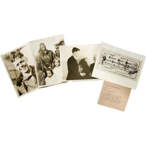 <B>Charles Lindbergh Press Photograph Archive.</B></I> A group of four photographs with International Newsreel backmarks taken during the time of Lindberg's famous New York to Paris flight including a 6” x 8” portrait of young Lindbergh; a 6” x 8” of Lindbergh surrounded by well wishers at Cherbourg, France with tipped on typed caption dated June 10, 1927; an 8” x 6” photo of Lindbergh shaking hands with Raymond Orteig with a typed caption dated June 17, 1927; and an 8” x 6” image of the beautifully embossed check Lindbergh received as a prize for his trans-Atlantic flight with tipped on typed caption dated June 17, 1927. A few of the photos are slightly cockled, else very good condition. <BR><BR><b>Shipping:</b> Flat Material, Small (<a target="_blank" href="http://www.heritageauctions.com/common/shipping.php">view shipping information</a>)