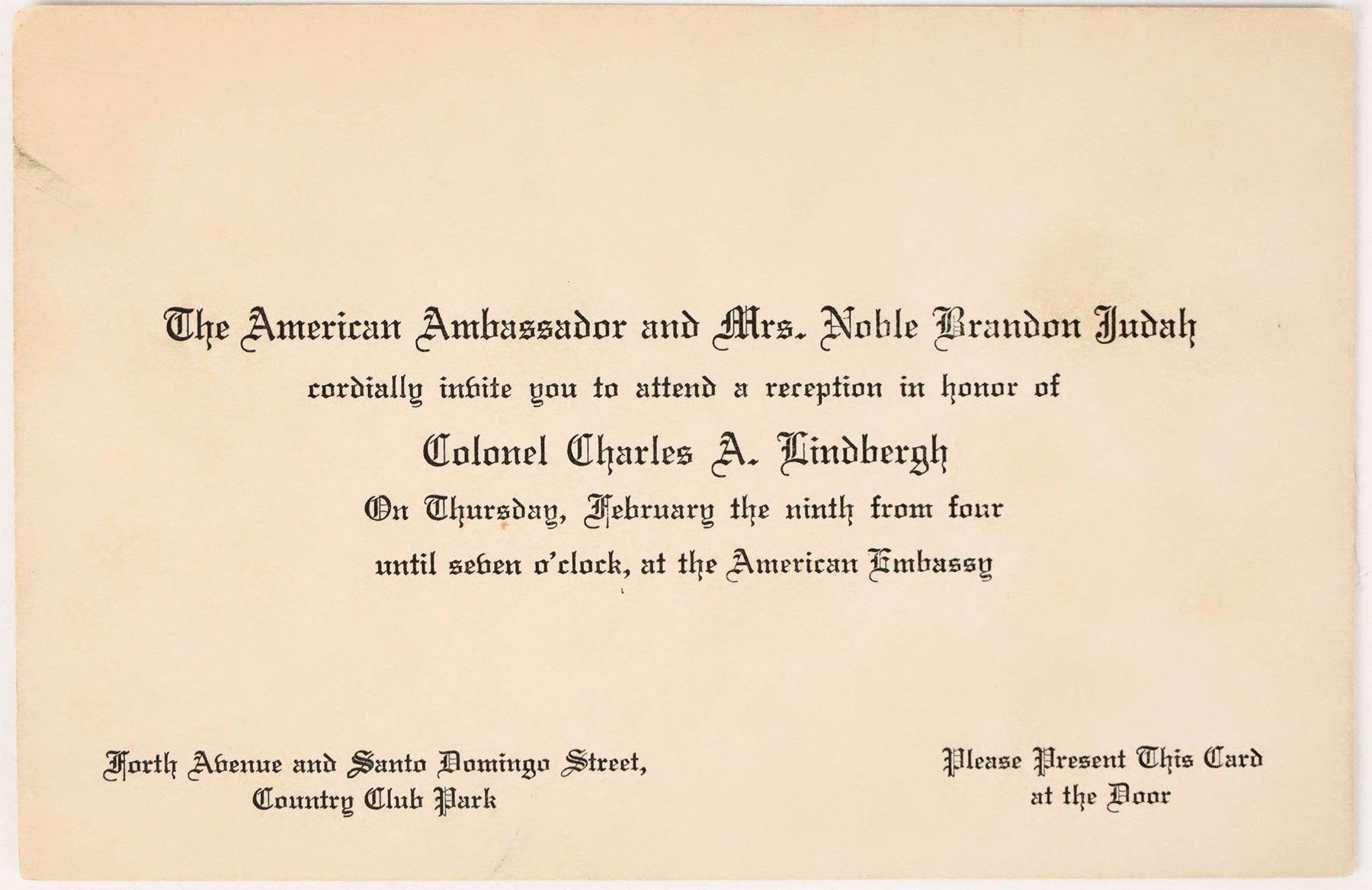 American Ambassador and Mrs. Noble Brandon Judah invitation to a reception to honor Lindbergh at the American Embassy. Heavy card stock, very good condition.