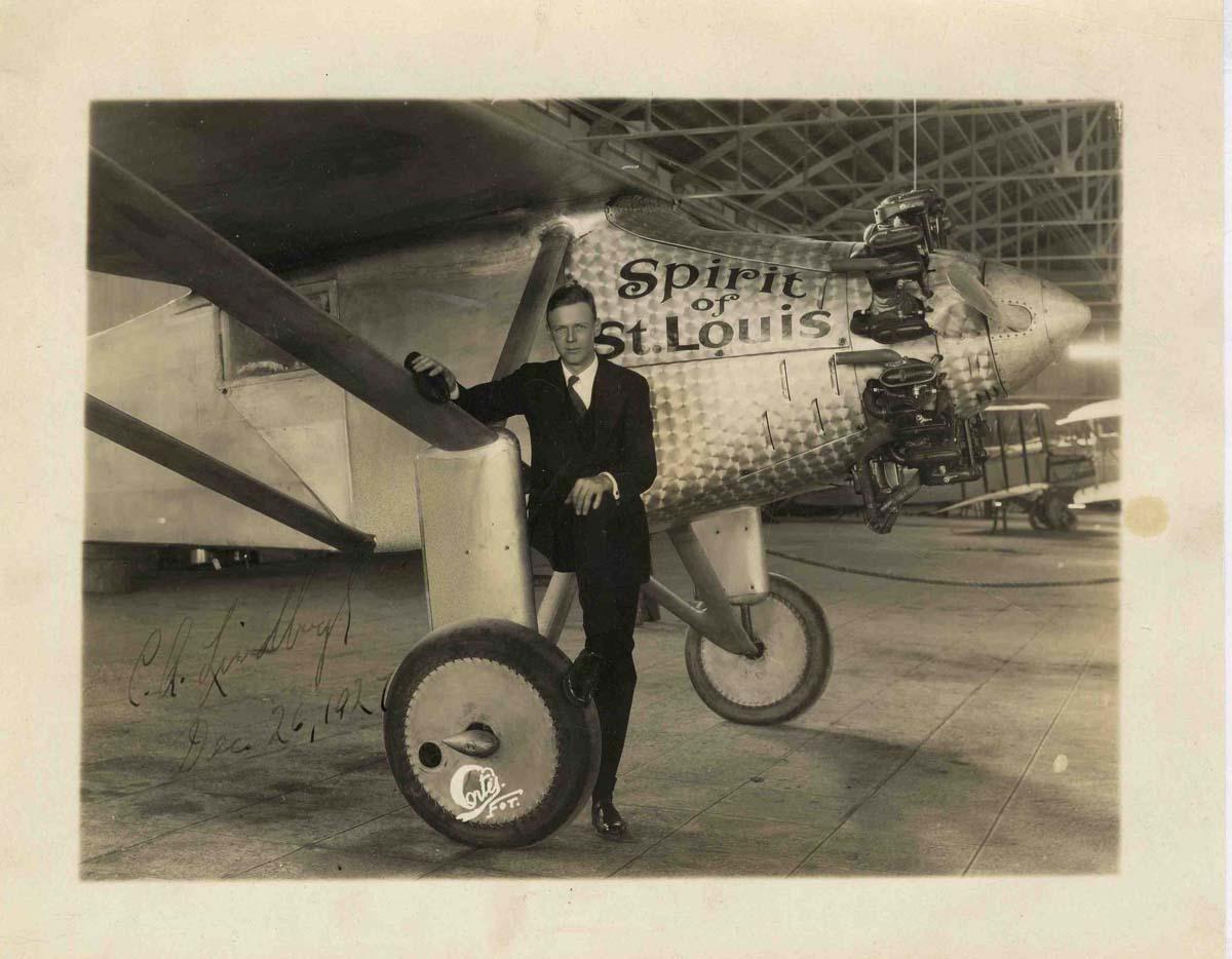 Excellent signed photograph of aviator Charles Lindbergh, looking neatly attired, posing with the Spirit of St. Louis in an airplane hangar. Signed in black fountain pen to the lower left margin, ''C.A. Lindbergh / Dec. 26, 1927''. On a promotional tour in Mexico at the time, Lindbergh met his future wife, Anne Morrow, just five days earlier. On the day he signed this photo, he took Anne on her first airplane ride. 9.5'' x 7.5'' photo is in very good condition with discoloration spot on border, not affecting image. A superb photograph.