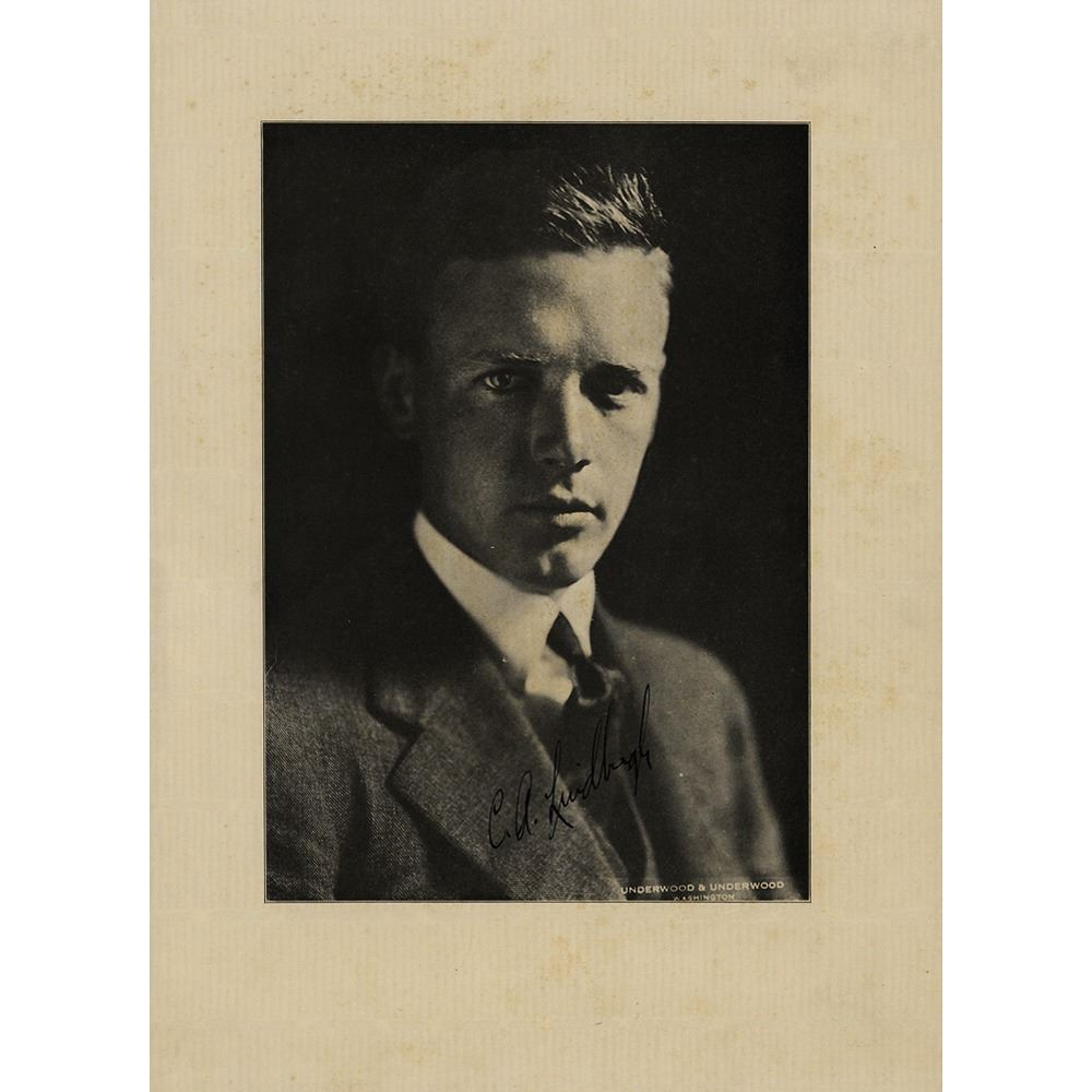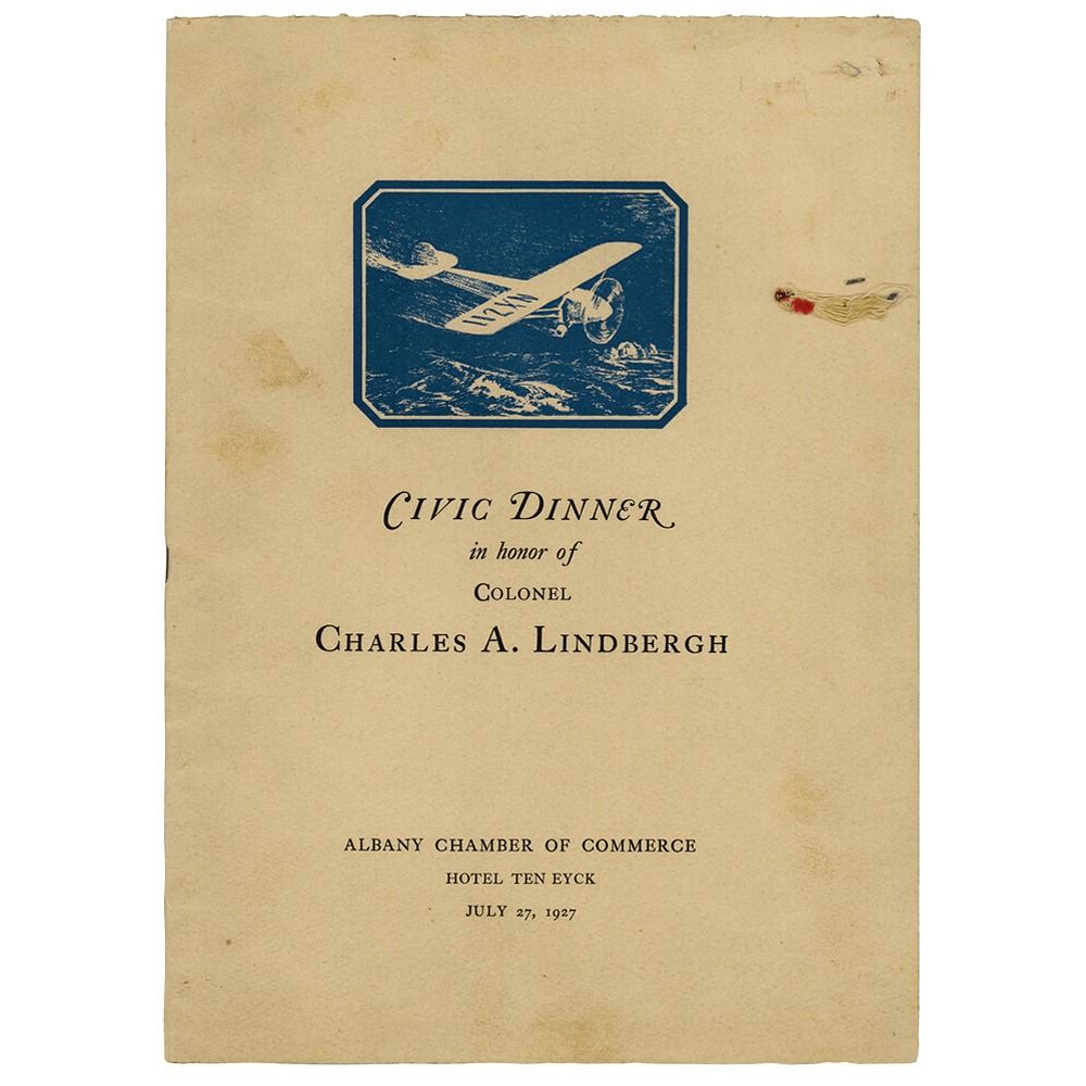 Vintage dinner program for a “Civic Dinner in honor of Colonel Charles A. Lindbergh,” held by the Albany Chamber of Commerce at the Hotel Ten Eyck in Albany, New York, on July 27, 1927, 9 x 12.5, signed inside on the opening page Underwood & Underwood portrait in fountain pen, “C. A. Lindbergh.” The program includes two table directories, which list Lindbergh seated at the “Speakers’ Table” with Governor Alfred E. Smith. In fine condition, with scattered stains to the covers, and the front bearing a hole to the upper right corner. On July 18, 1927, Lindbergh was promoted to the rank of colonel in the Air Corps of the Officers Reserve Corps of the U.S. Army. An appealing program with a handsome portrait of Lindbergh signed two months after his famous 1927 solo transatlantic flight.