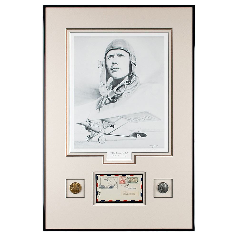 Air mail postal cover, 6 x 3.5, postmarked on March 9, 1929, signed vertically along the left edge in black ink by Charles Lindbergh, "C. A. Lindbergh." Handsomely matted with a pair of commemorative coins and a limited edition print by Lonnie Ortega entitled 'The Lone Eagle,' numbered 85/275, and signed in the lower border by the artist in pencil; framed together to an overall size of 20.25 x 30.25. In fine condition.