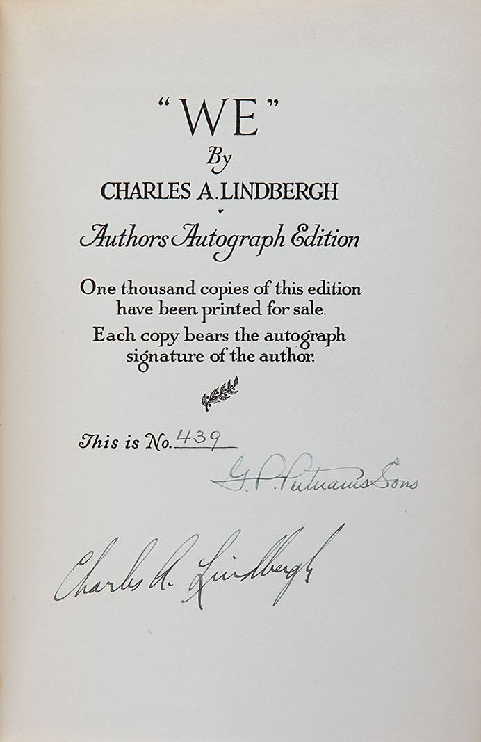 Signed book: We. Authors autograph edition, limited issue, numbered 439/1000. NY: G. P. Putnam's Sons, 1927. Hardcover, 6.75 x 9.75, 308 pages. Signed on the colophon in fountain pen by Lindbergh, "Charles A. Lindbergh," and by the publisher. Autographic condition: very fine. Book condition: VG/None, with edgewear and sunning to spine. A beautifully signed, limited edition example of Lindbergh's autobiography, published just after his famous 1927 solo transatlantic flight.