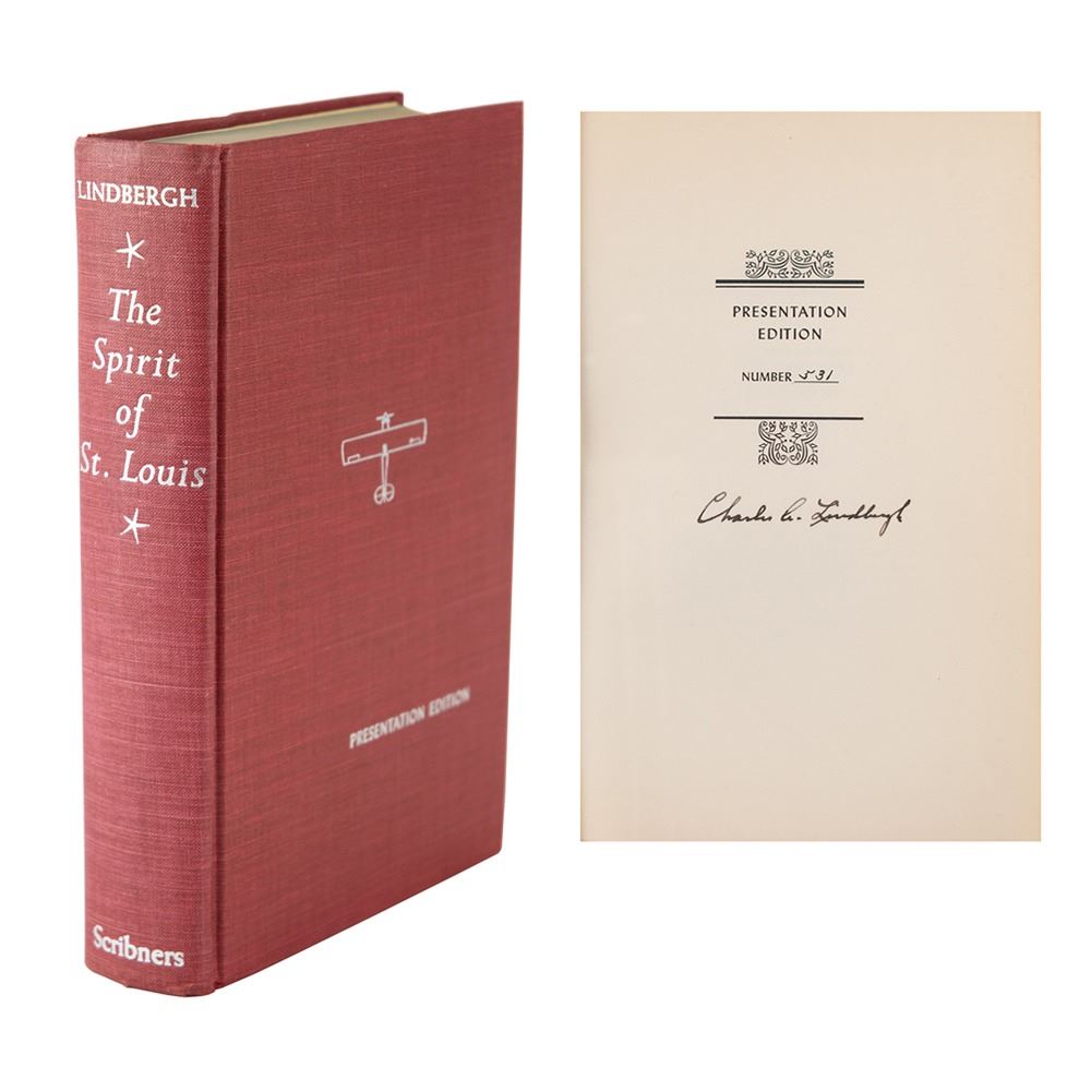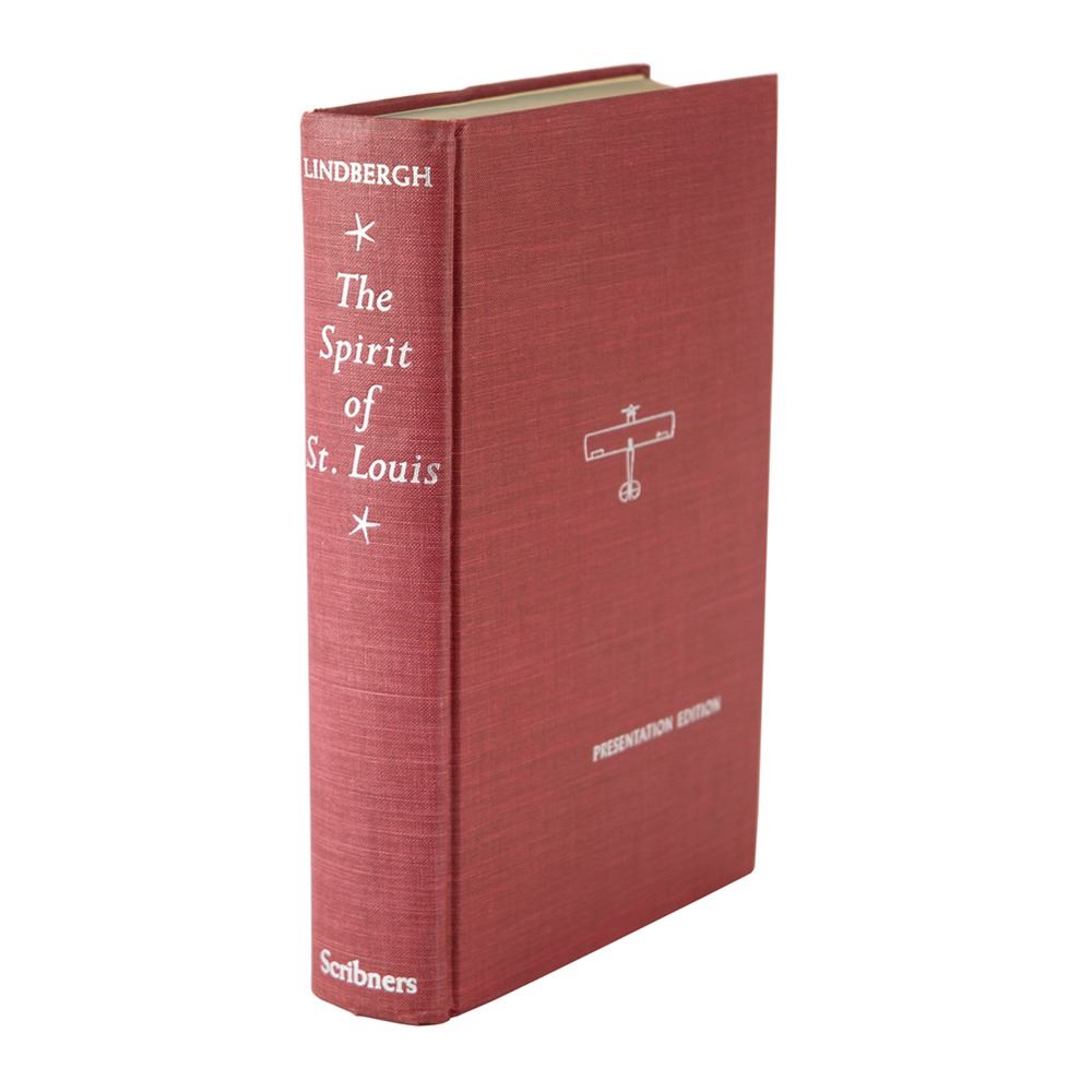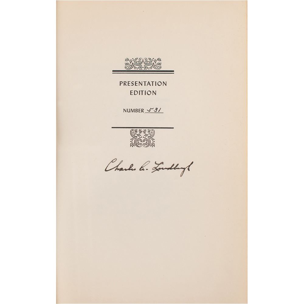 Signed book: The Spirit of St. Louis. Limited presentation edition, number 531. NY: Charles Scribner's Sons, 1953. Hardcover with acetate jacket, 5.75 x 8.5, 562 pages. Signed on the colophon in fountain pen, "Charles A. Lindbergh." Autographic condition: fine. Book condition VG/VG, with a bump to the top edge of the rear board and some cracks to the acetate jacket. A sought-after example of this high point of aviation literature.
