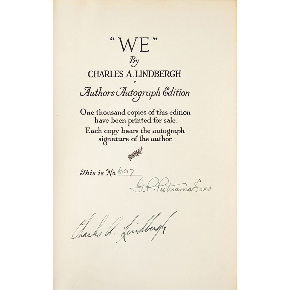 Signed book: We. Special author's autograph edition, limited issue, numbered 607/1000. NY: G. P. Putnam's Sons, 1927. Hardcover, 6.75 x 10.25, 308 pages. Signed on the colophon in fountain pen, "Charles A. Lindbergh." Autographic condition: fine. Book condition: VG/None, with irregular toning to joints, sunning to spine, an ownership inscription to first free end page, and owner's notations on Lindbergh and his flight neatly penned on the last three pages. A beautifully signed, limited edition example of Lindbergh's autobiography, published just after his famous 1927 solo transatlantic flight.