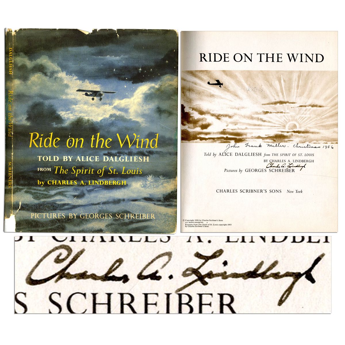Charles Lindbergh signed book ''Ride on the Wind'' published by Charles Scribner's Sons: New York: 1956. The famed aviator inscribes the title page: ''Charles A. Lindbergh'' in black ink. This is the story of the first non-stop flight from America to Europe as told in his famous publication ''The Spirit of St. Louis,'' but adapted to a children's book by Alice Dalgliesh. Fully illustrated by Georges Schreiber, the tale runs 30pp. Housed in pictorial cloth boards with original dustjacket. Measures 8.25'' x 10.5''. Signature page shows the previous owner's name and ''Christmas 1956''. Bumping to board corners and wear to edges; very good plus. Chipping and some paper loss to dustjacket edges; good condition.